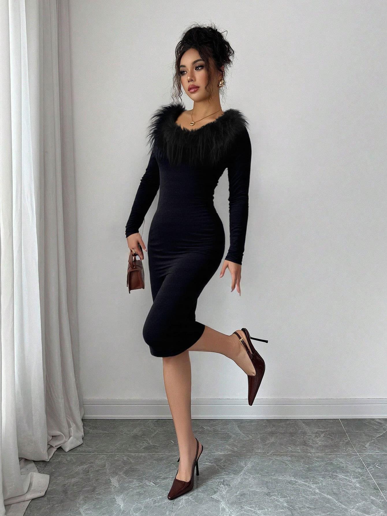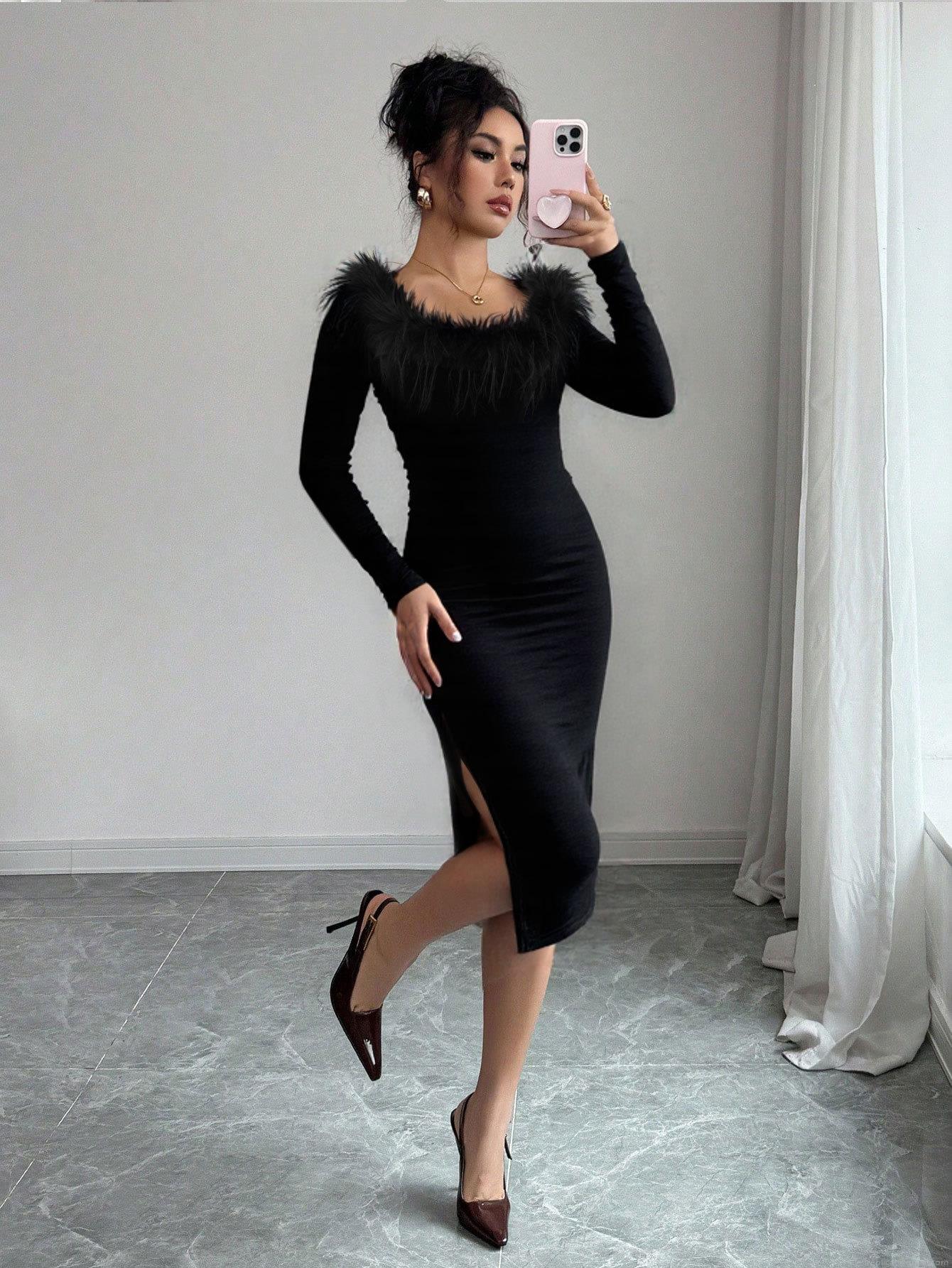 • Elegant Black Long Sleeve Bodycon Midi Dress With Faux Fur Collar Side Slit Sexy Evening Party Gown For Women Polyester Spandex Knit Dress
