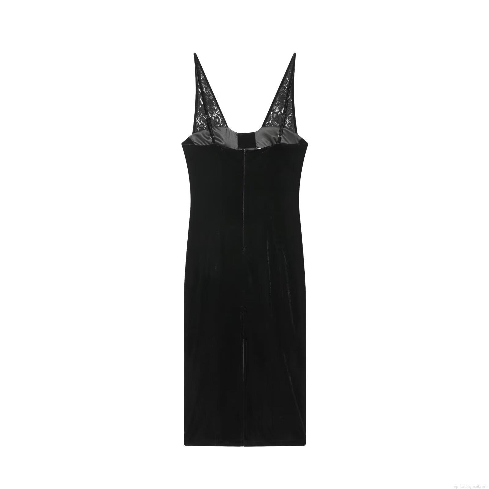 • Elegant Black Velvet Lace Stitching V-Neck Slip Dress for Women Slim Fit Backless Side Slit Socialite Evening Party Midi Dress