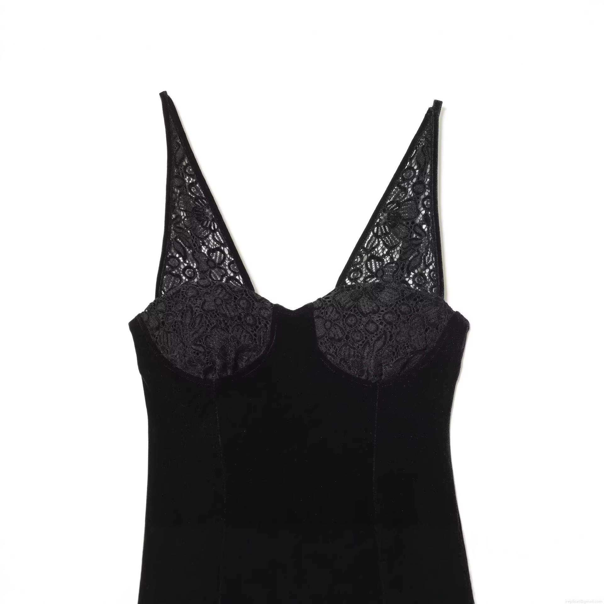 Elegant Black Velvet Lace Stitching V-Neck Slip Dress for Women Slim Fit Backless Side Slit Socialite Evening Party Midi Dress