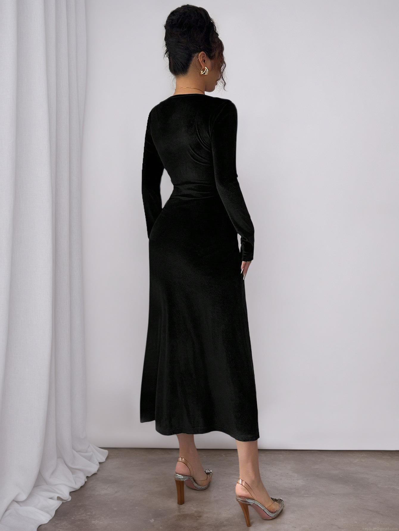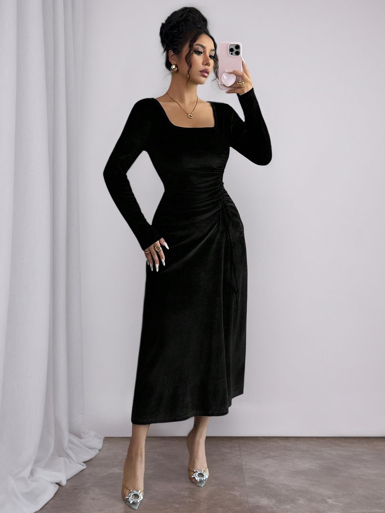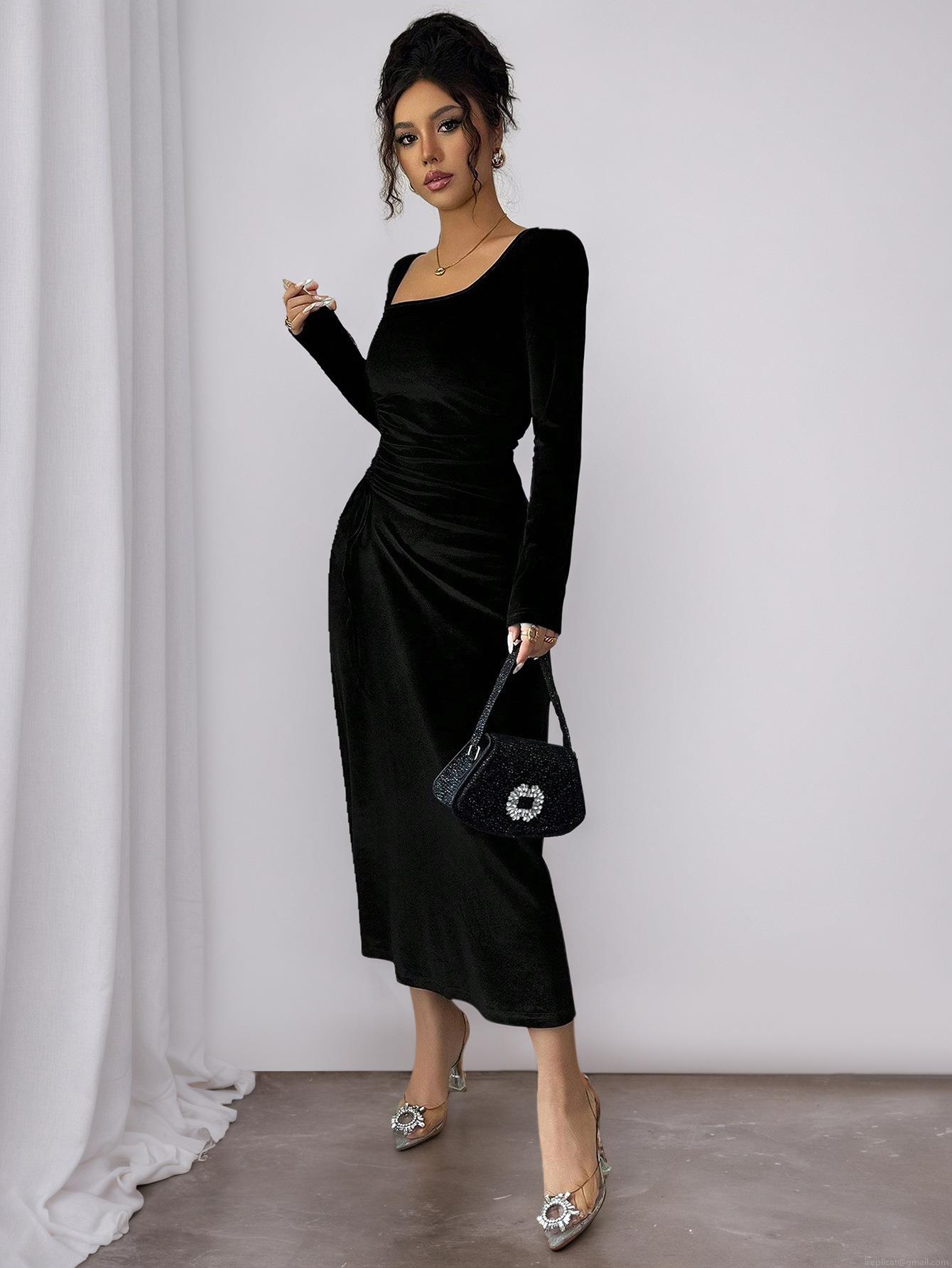 • Elegant Black Velvet Midi Dress For Women Vintage Square Neck Side Ruched Long Sleeve Slim Fit Bodycon Dress For Banquet Party Autumn Winter