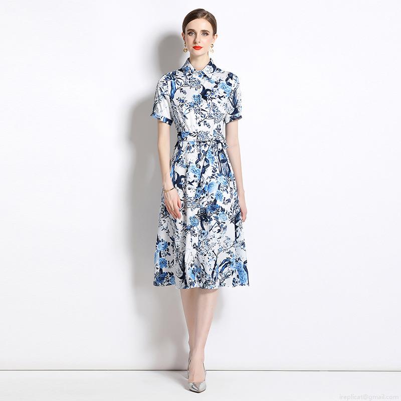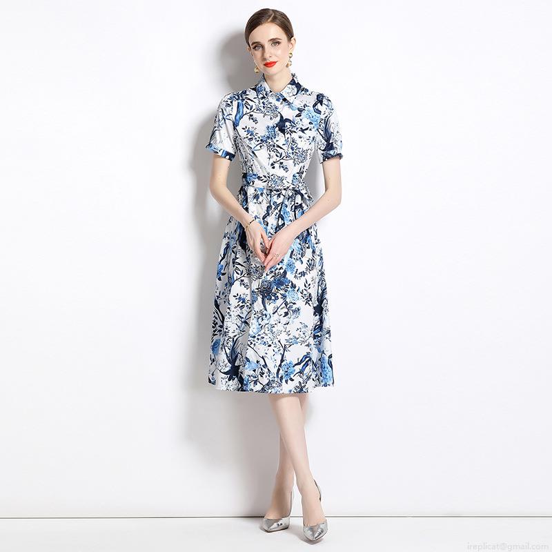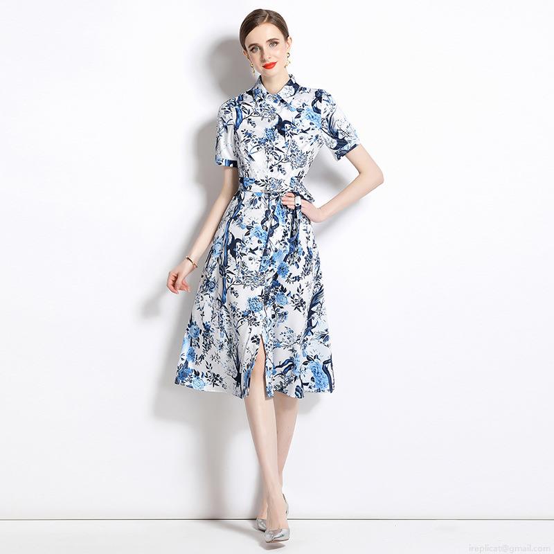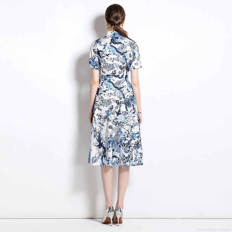 Elegant Blue and White Floral Bird Print Midi Dress for Women Short Sleeve Shirt Collar A-Line Summer Dress with Belt Single Breasted Vintage Party Dress