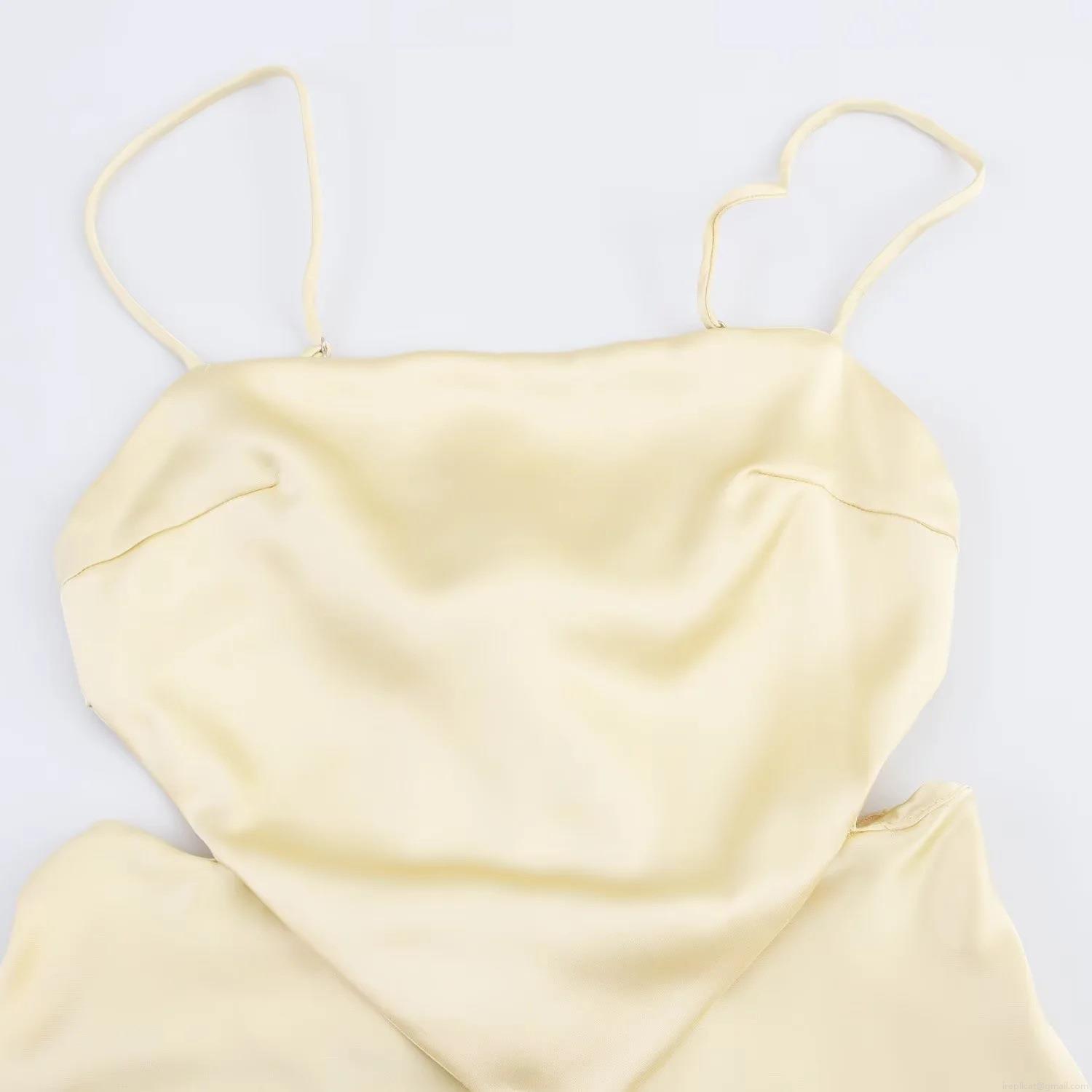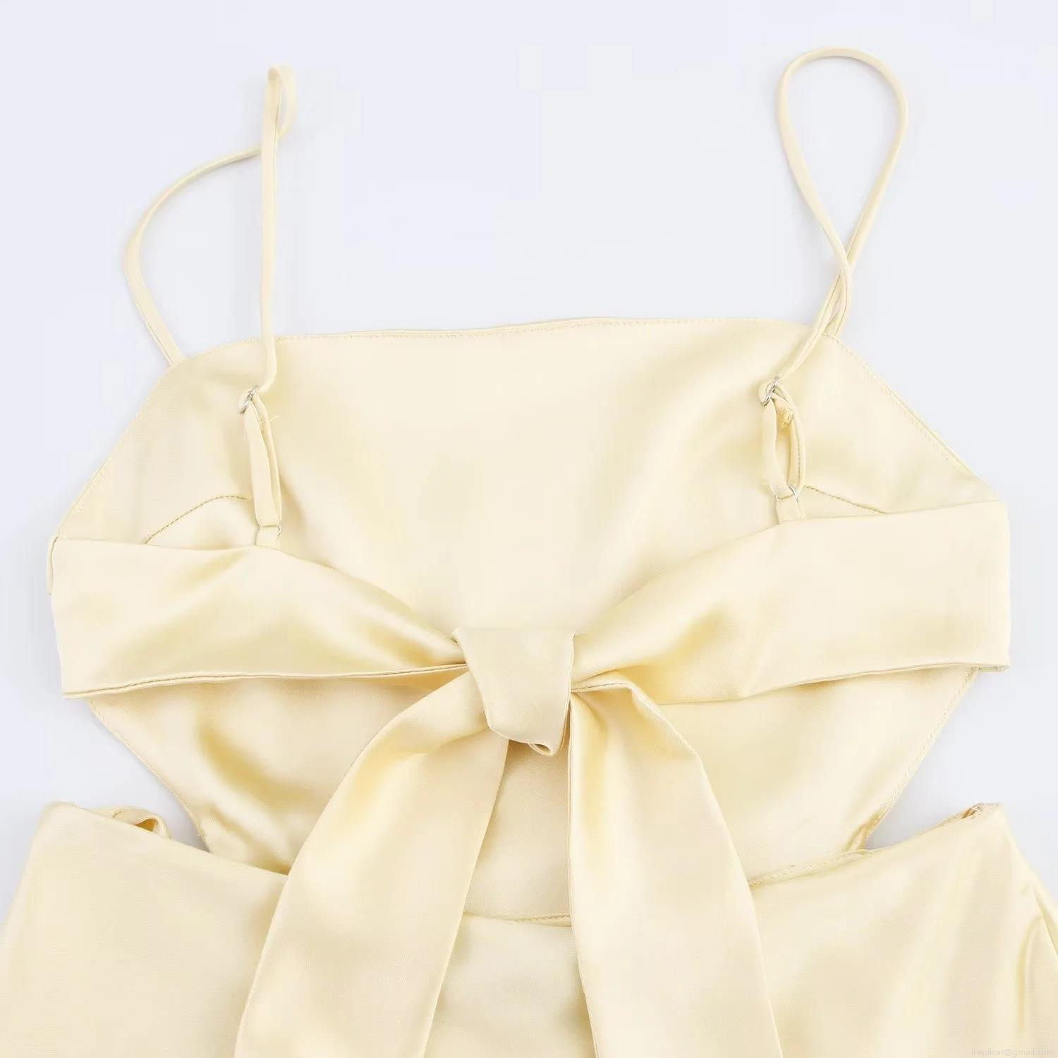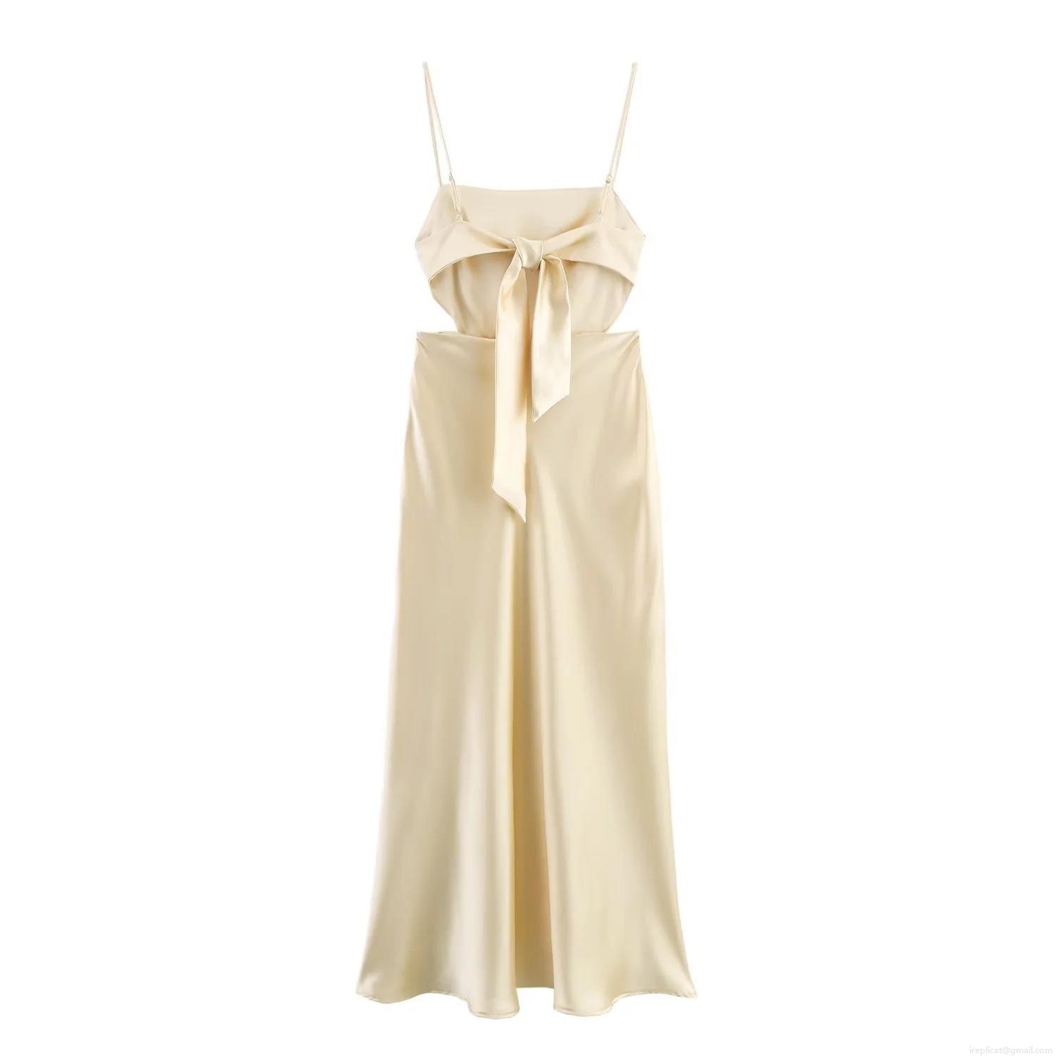 • Elegant Champagne Satin Backless Camisole Dress With Bow Detail Waist Hollow Out Midi Party Evening Dresses For Women