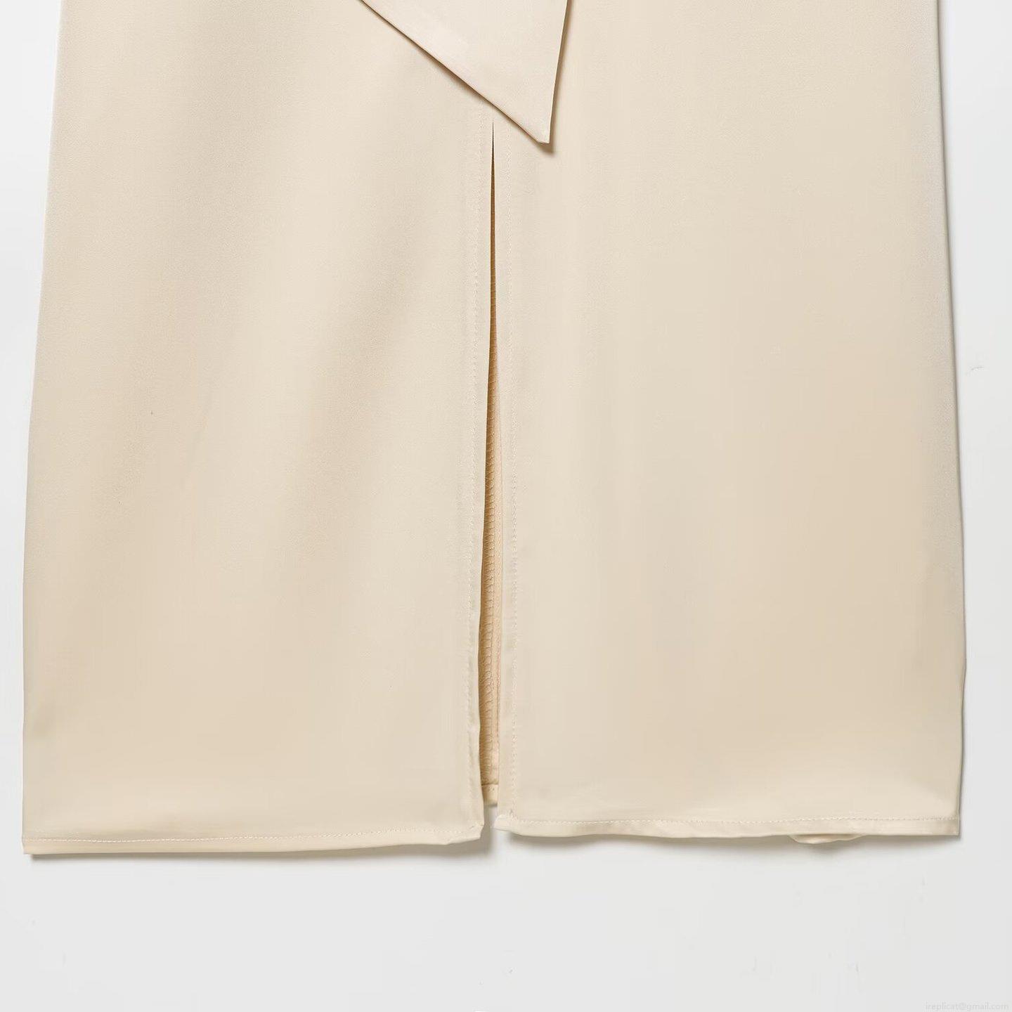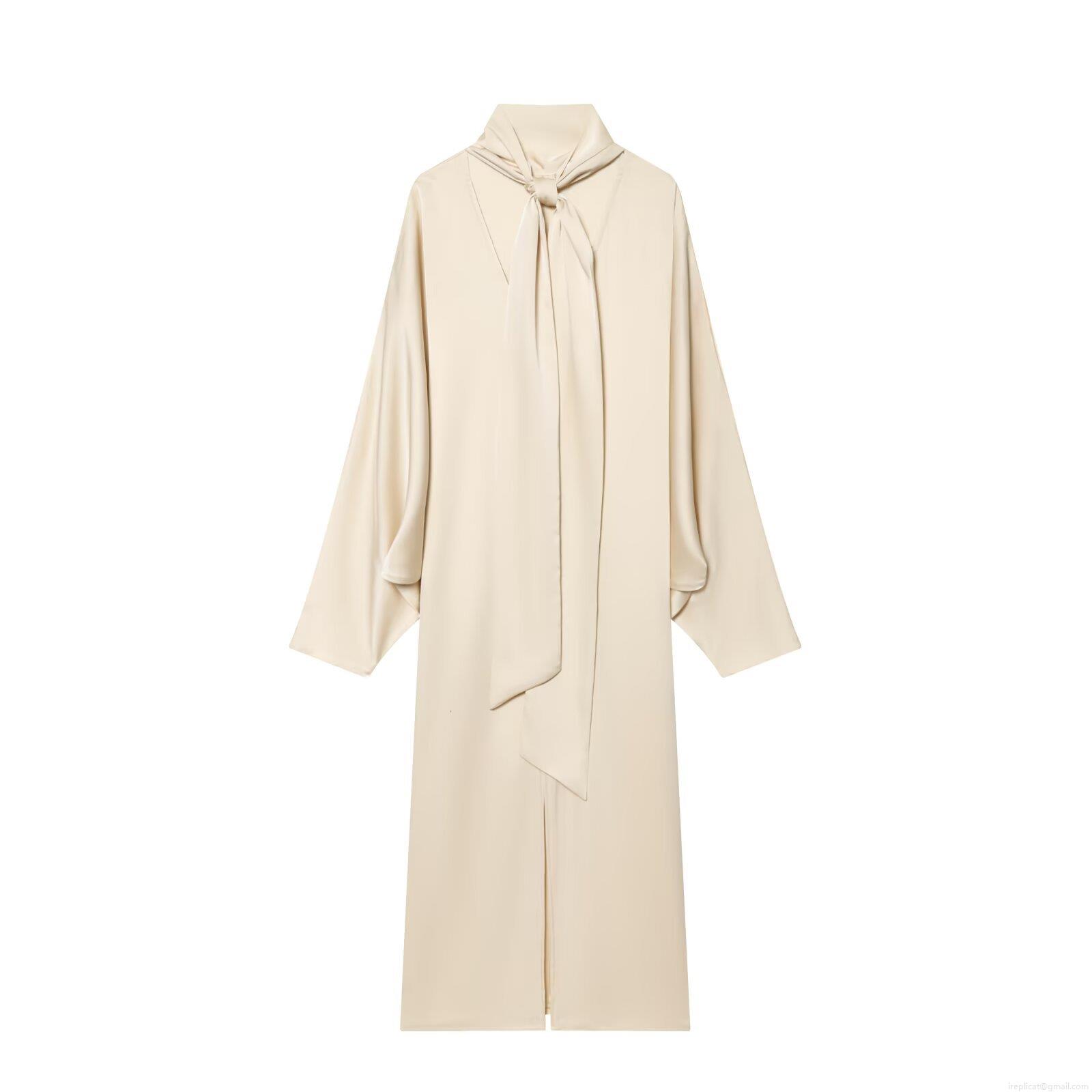 Elegant Champagne Satin Midi Dress High Neck Tie Back Long Sleeve Batwing Sleeve Loose A-Line Dress For Women Party Casual Evening Formal Wear