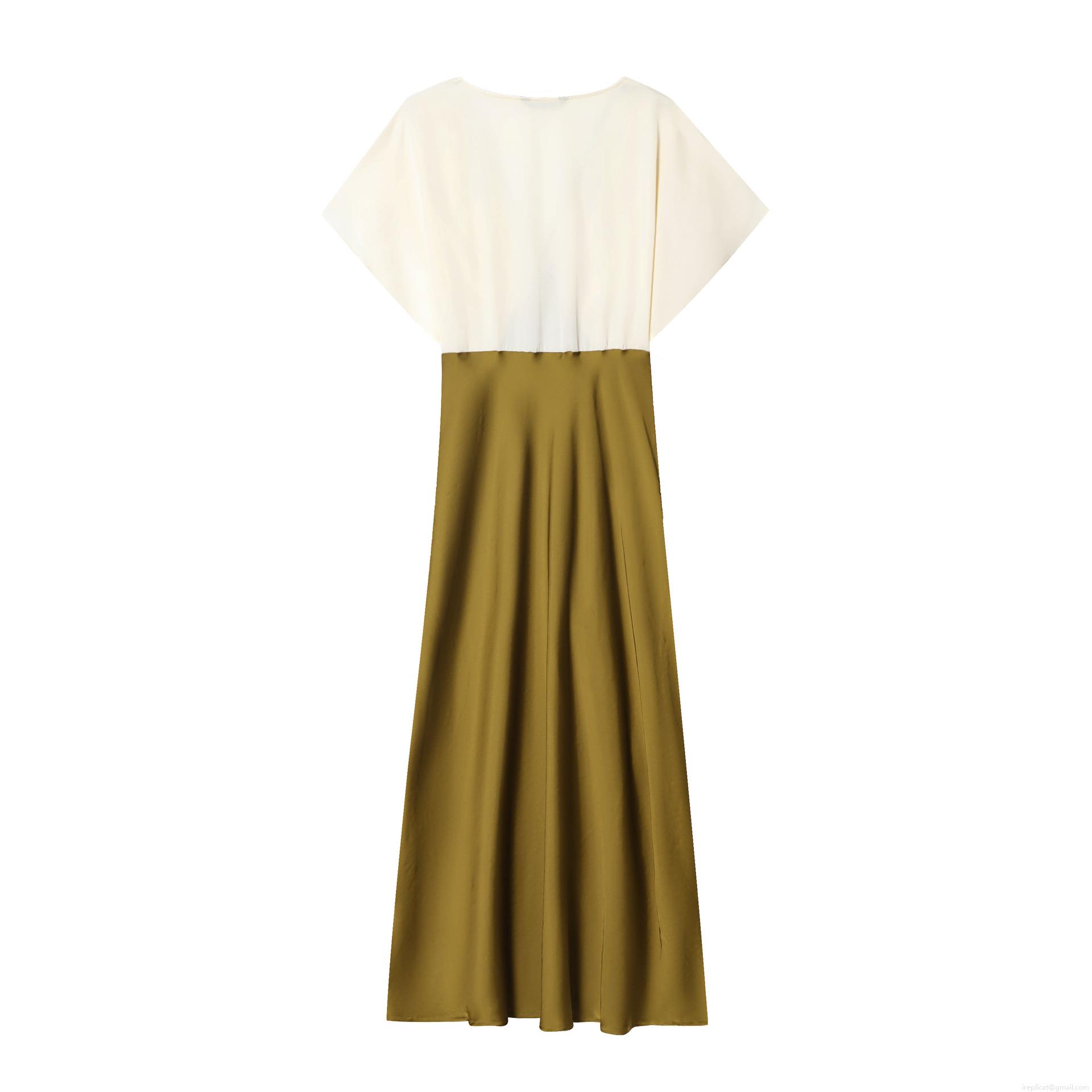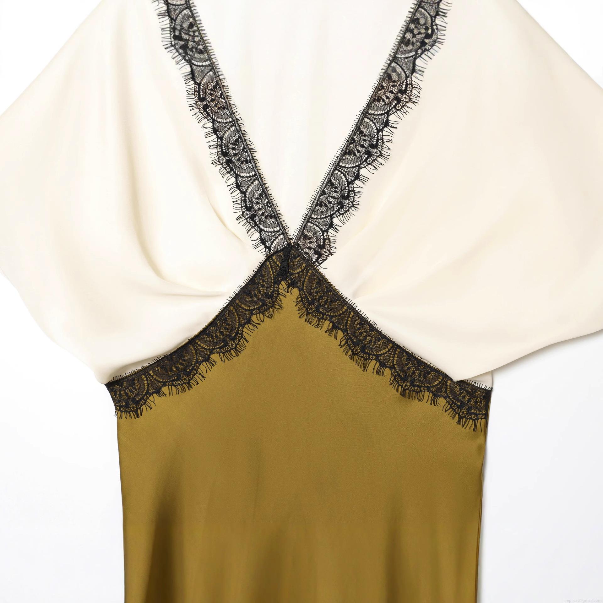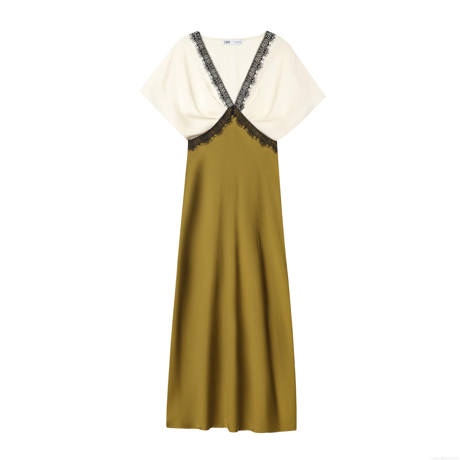 • Elegant Color Block Double-sided Acetate Satin Midi Dress With Black Lace Trim V-Neck Short Sleeve Socialite Style Evening Party Dress For Women