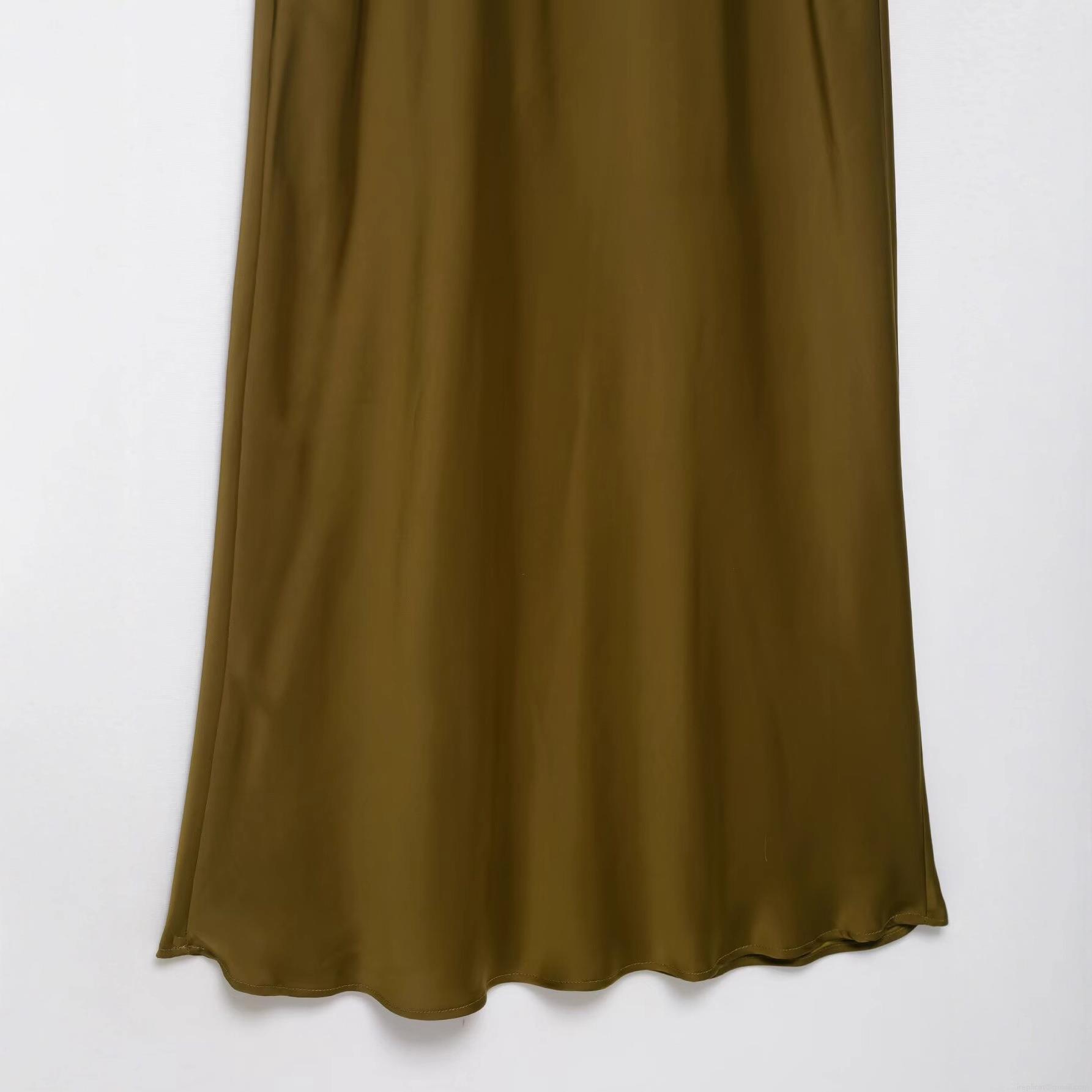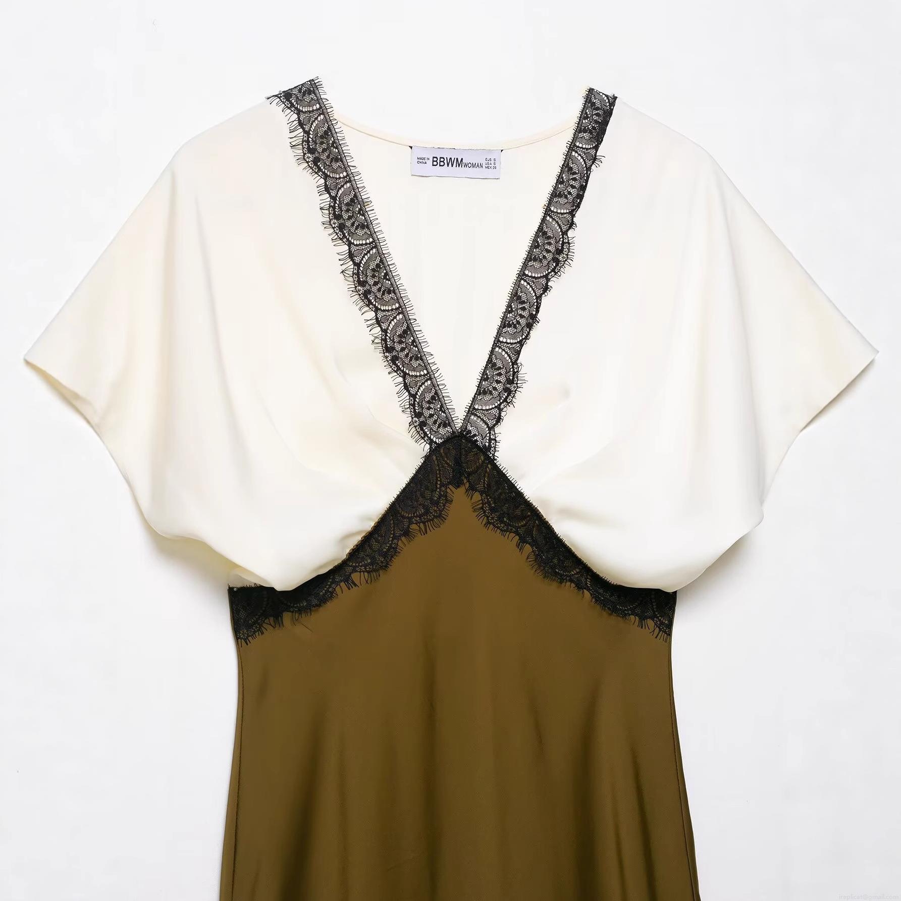 • Elegant Color-Block Satin Midi Dress With Black Lace Trim V-Neck Short Sleeve High Waist A-Line Long Dress For Women Party Social Celebrity Style