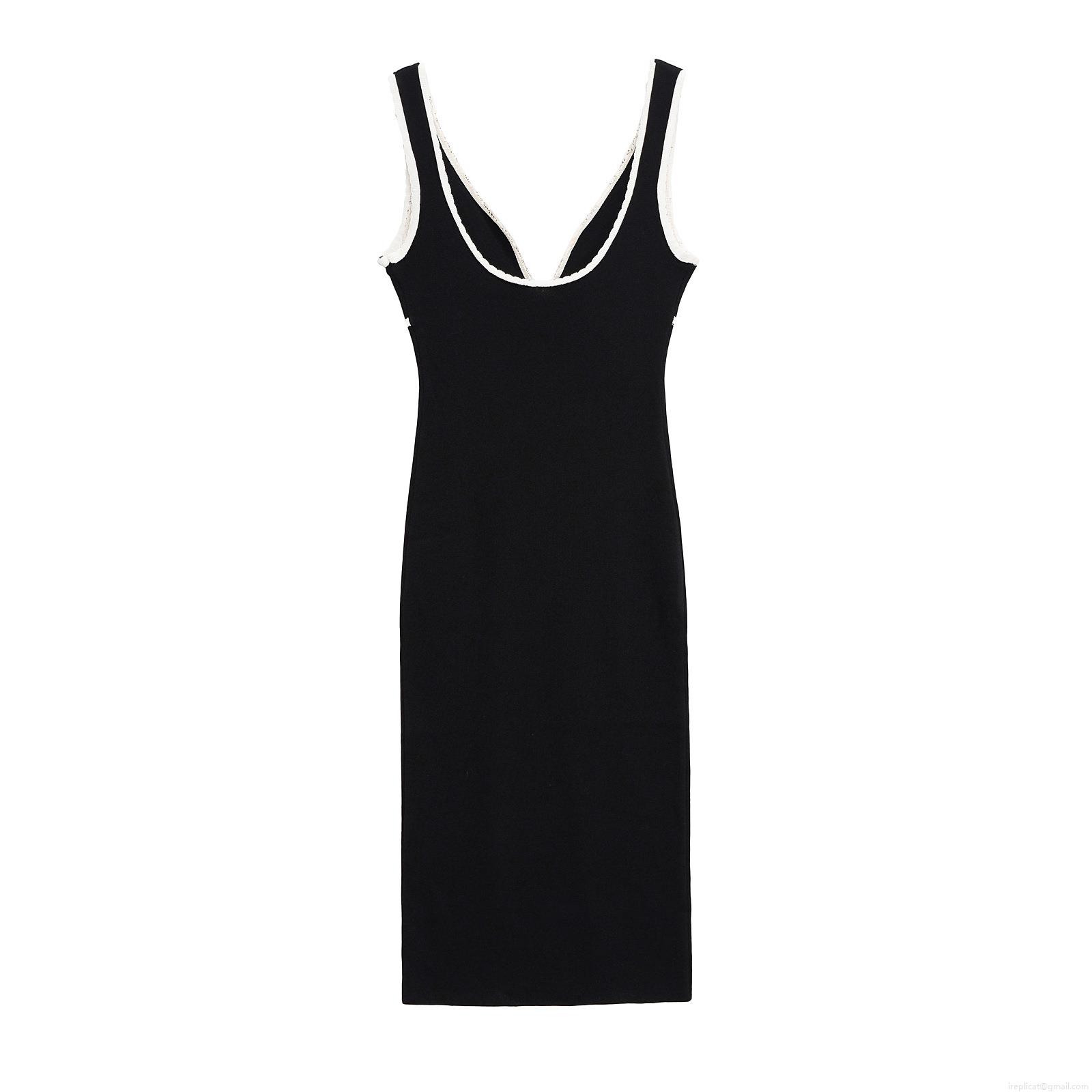 Elegant Contrast Trim V-Neck Sleeveless Slim Fit Knit Midi Dress Mercerized Cotton Black White Bodycon Tank Dress For Women Party Daily Wear