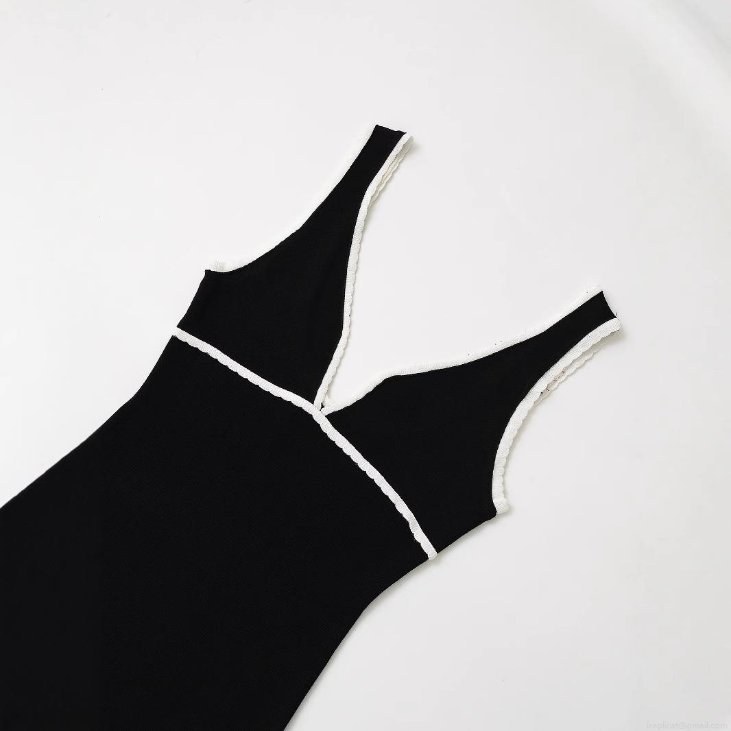 • Elegant Contrast Trim V-Neck Sleeveless Slim Fit Knit Midi Dress Mercerized Cotton Black White Bodycon Tank Dress For Women Party Daily Wear