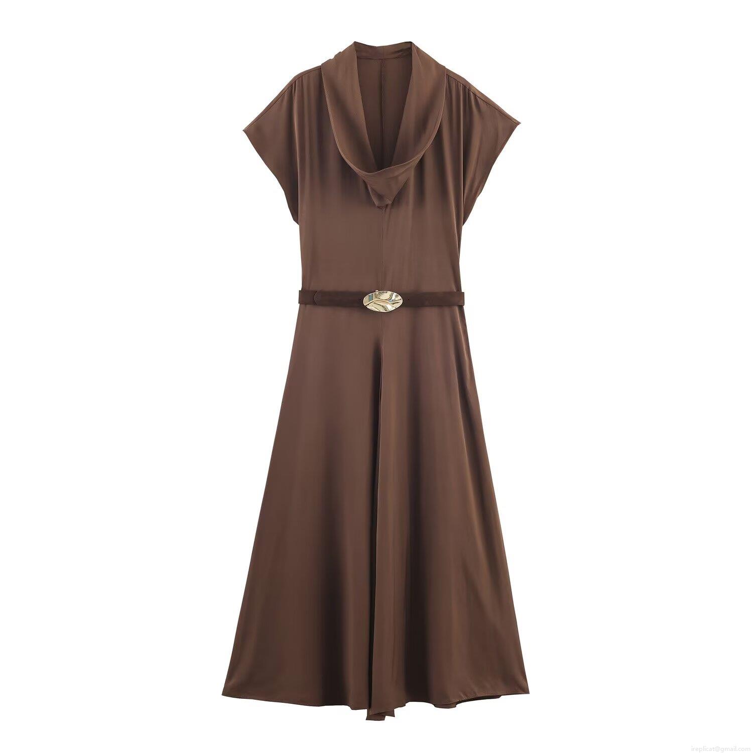 • Elegant Cowl Neck Sleeveless Satin Midi Dress With Belt Solid Color Silk Texture Party Evening Dress For Women High Waist A-Line Long Dress