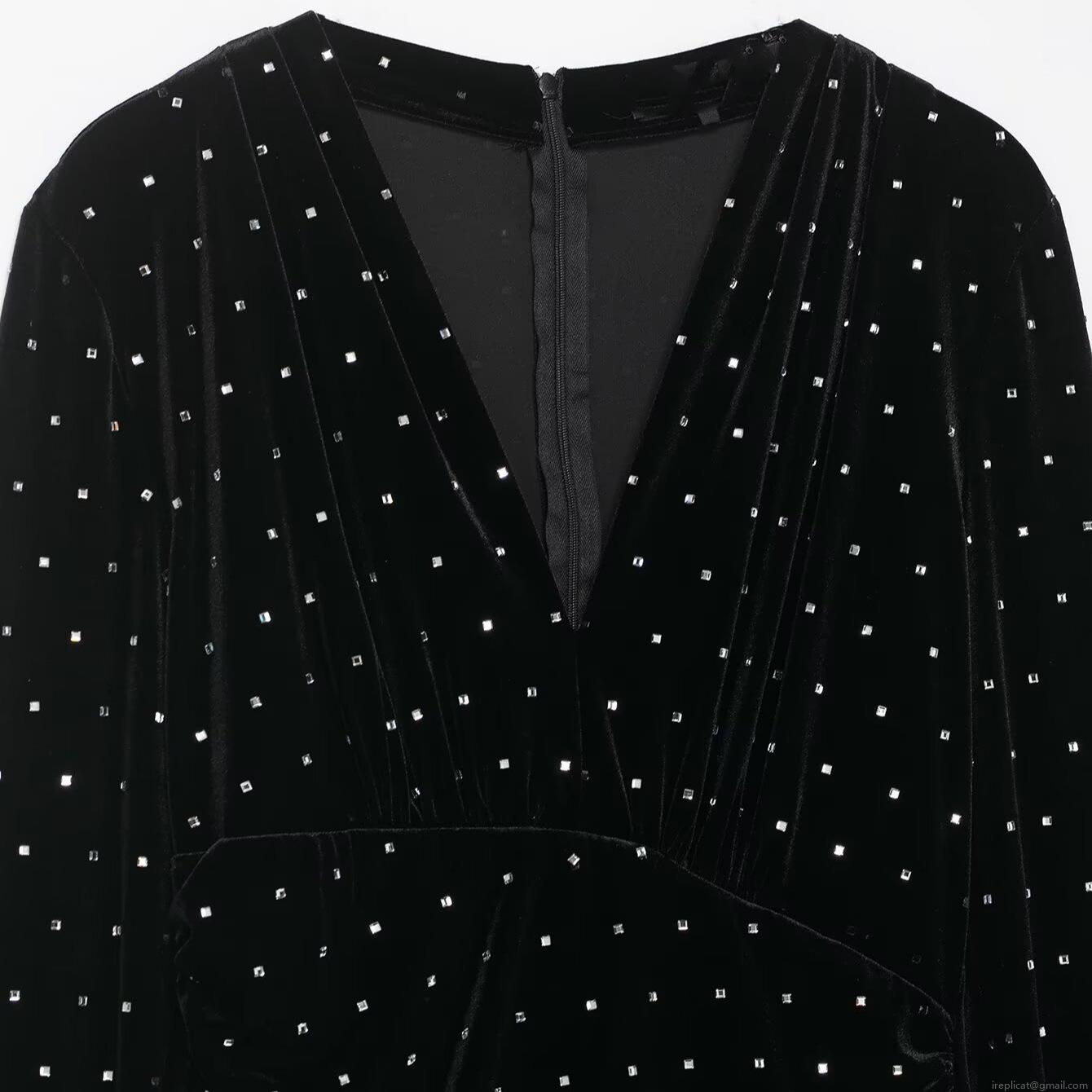 • Elegant Deep V-Neck Velvet Midi Dress For Women Sexy Long Sleeve Rhinestone Studded Slim Fit Party Gown Autumn Winter Evening Clubwear Dress