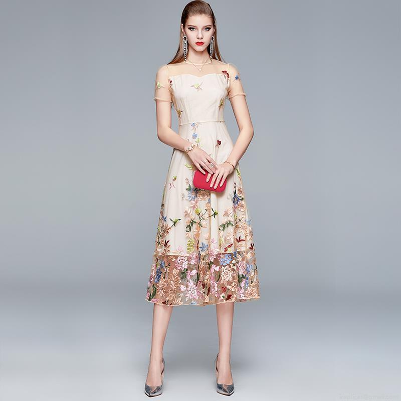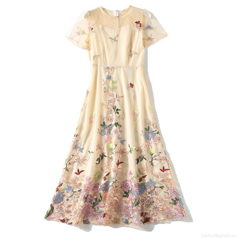 Elegant Floral Embroidered Mesh Midi Dress Women High Waist Short Sleeve Party Dress Luxury Heavy Embroidery Apricot Evening Dress