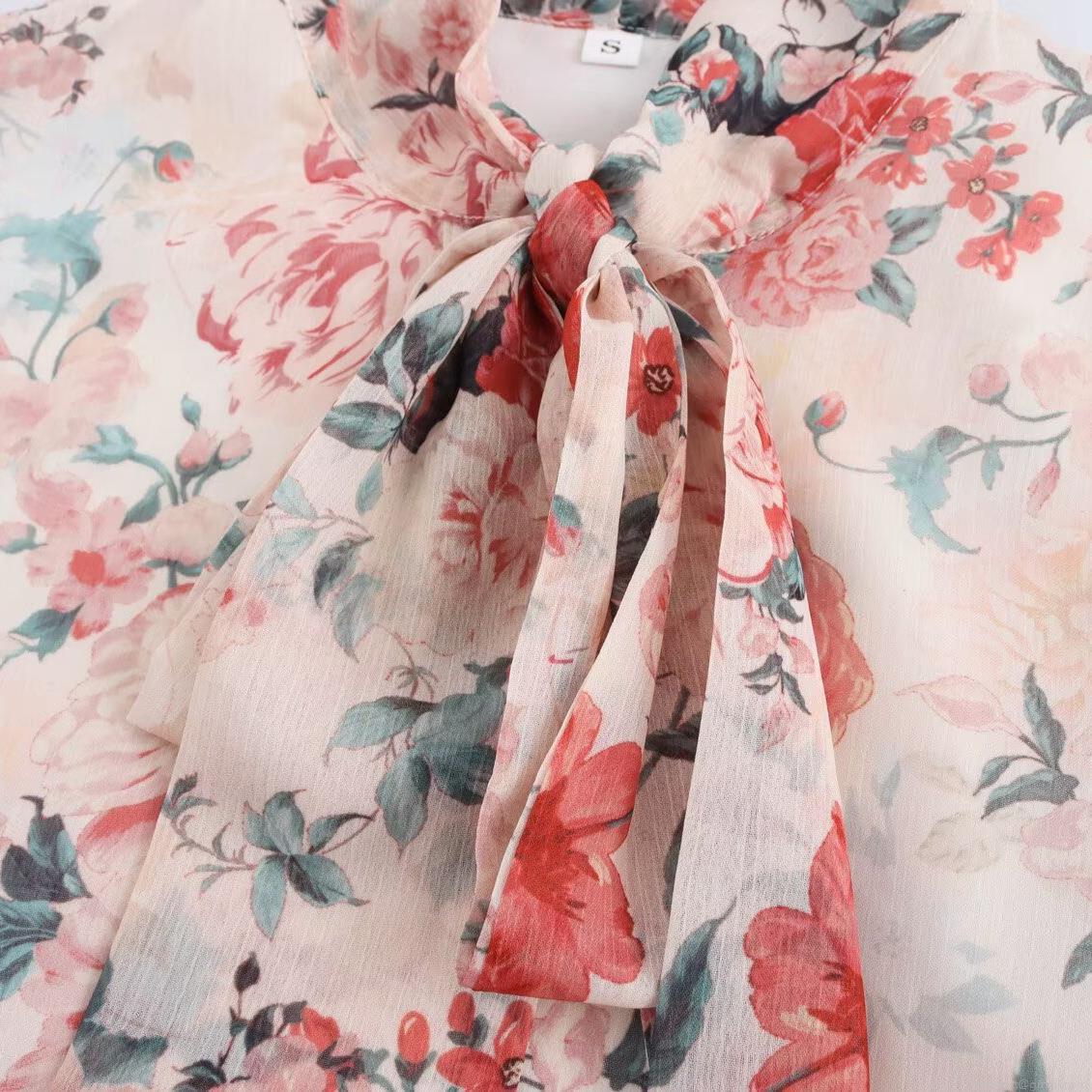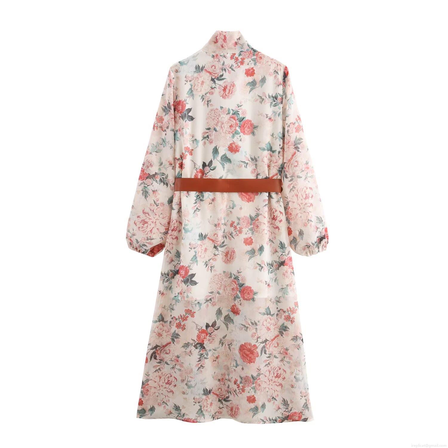 Elegant Floral Print Chiffon Midi Dress For Women Long Sleeve Bow Tie V Neck Vintage Sweet Flower Long Dress With Brown Belt