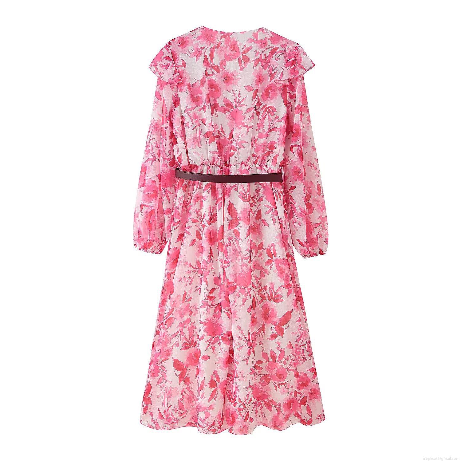 • Elegant Floral Print Midi Dress With Belt V Neck Ruffle Long Sleeve Chiffon Polyester Fall Casual Women Party Flowy A-Line Dress