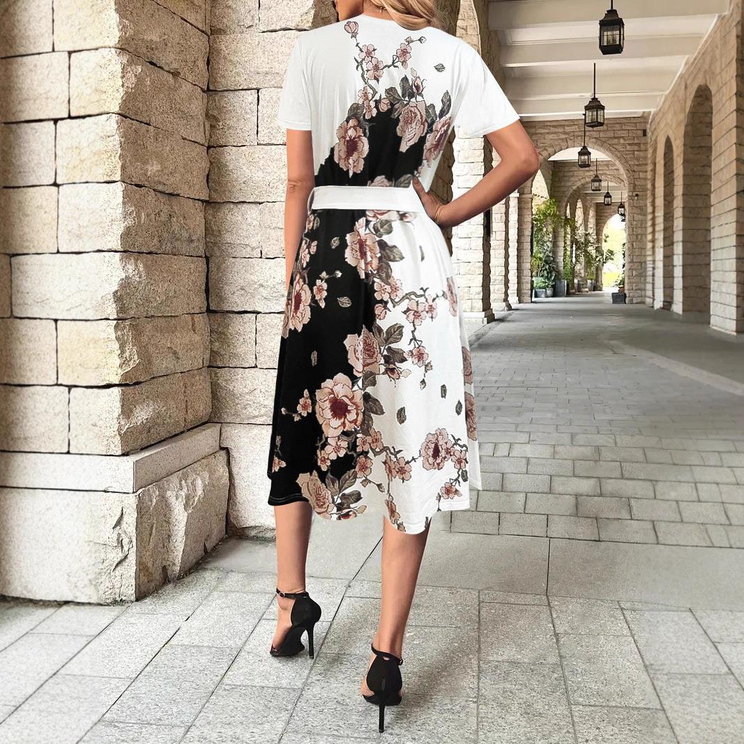 • Elegant Floral Print Short Sleeve Maxi Dress Polyester Spandex Blend With Waist Belt Commuter A-Line Round Neck Casual Summer Dress For Women