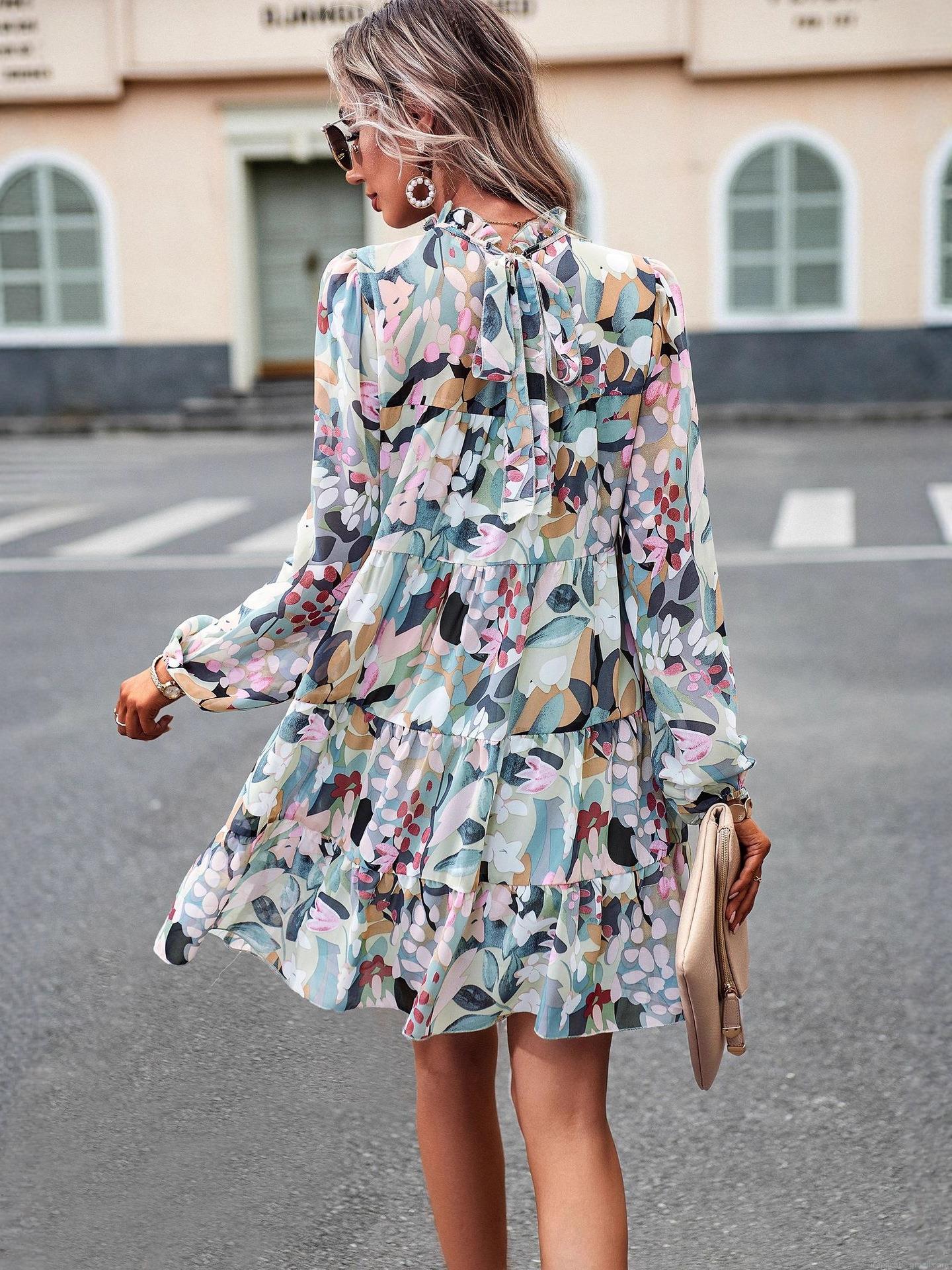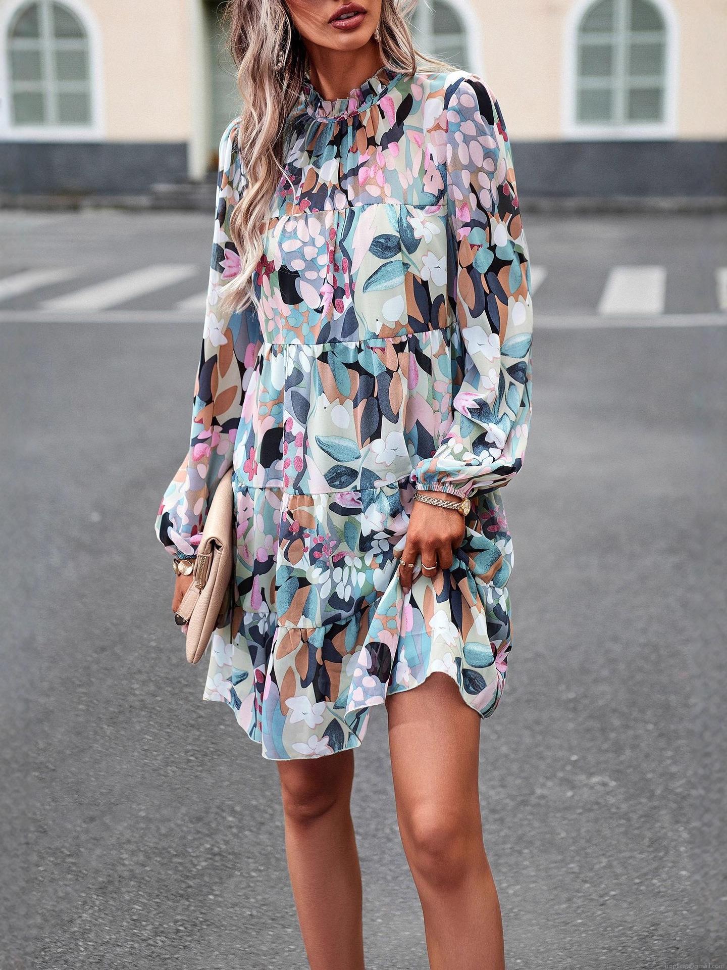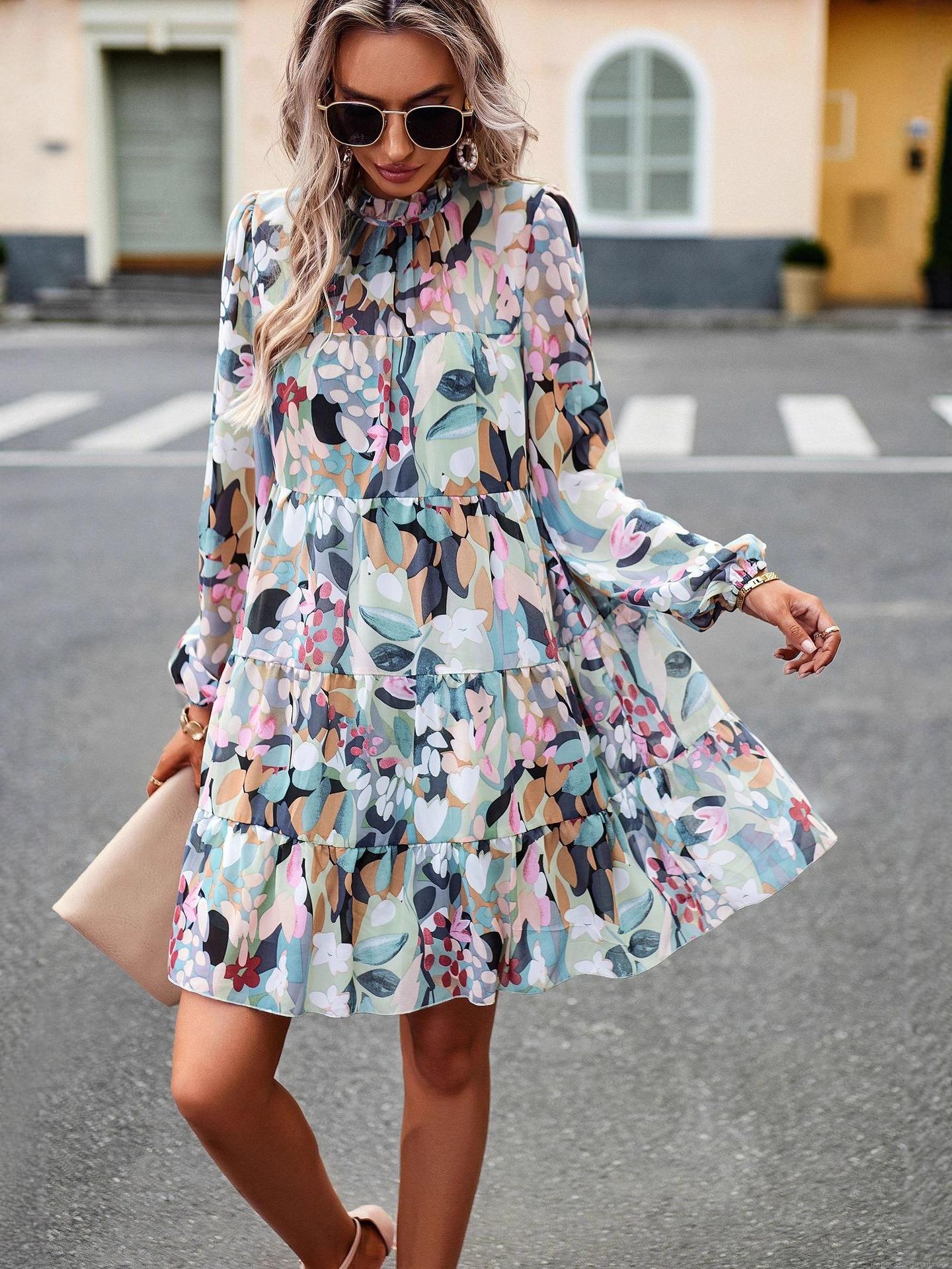 • Elegant Floral Print Tiered Maxi Dress Women Long Sleeve Stand Collar Ruffle Cake Dress Casual Party Autumn Winter 100% Polyester Gown