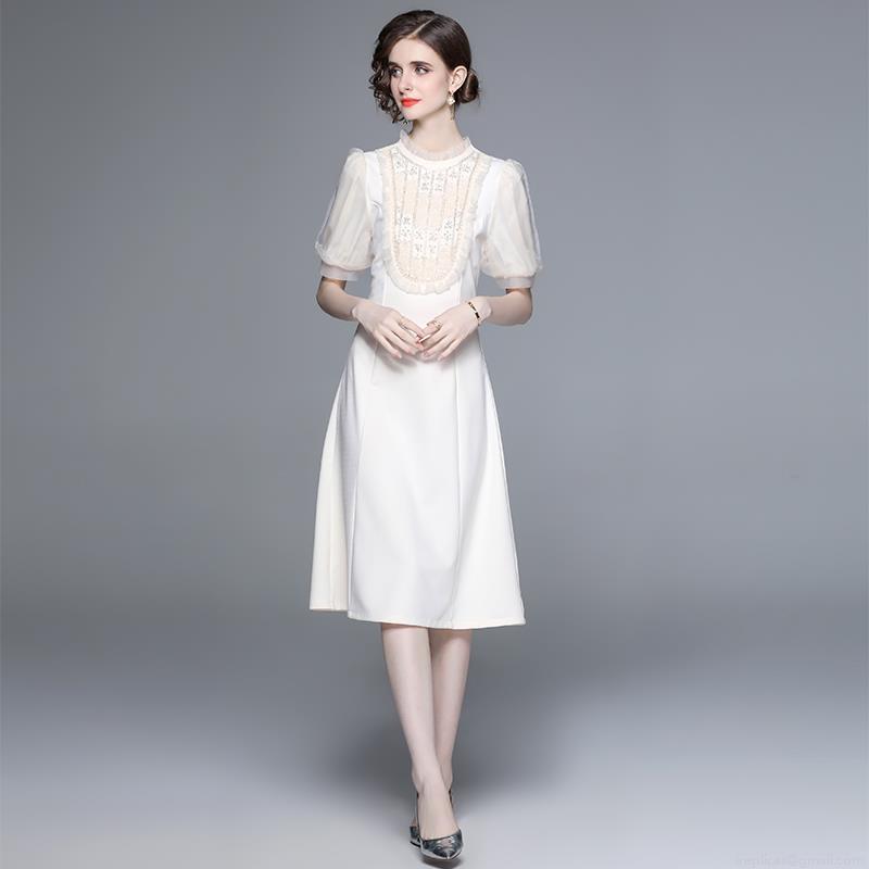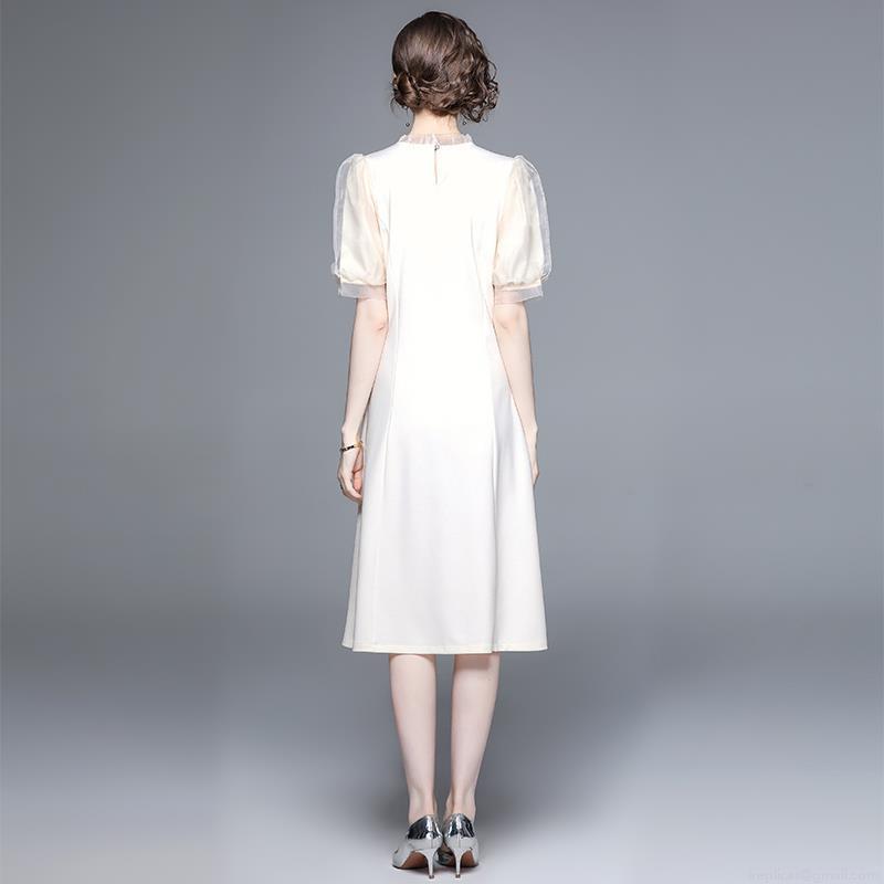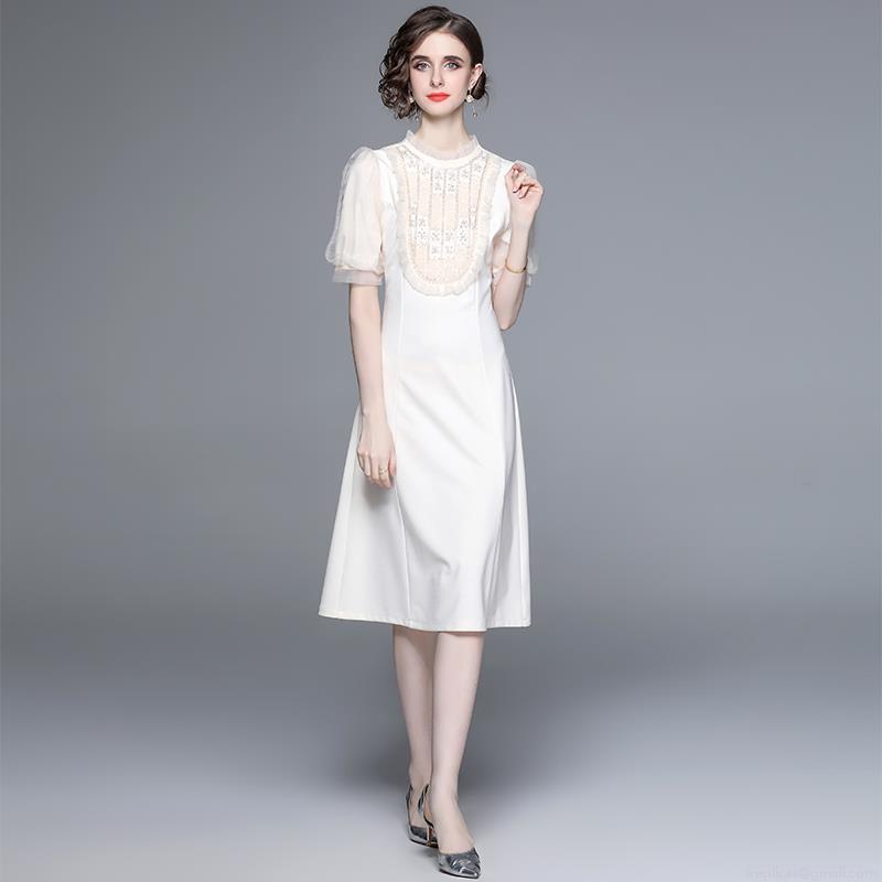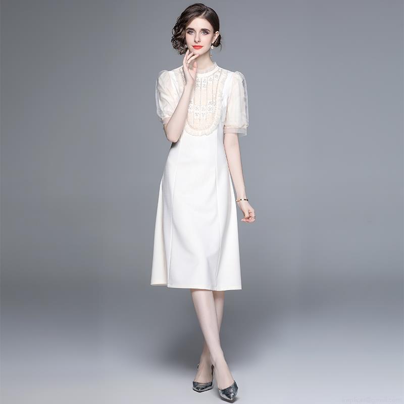 • Elegant French Puff Sleeve Midi Dress Women Heavy Industry Beaded Lace Embroidery Patchwork Slim Fit Party Dress White Apricot Dresses