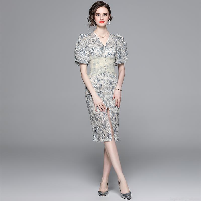 Floral Pattern, Pleats, Plants And Flowers, V-neck, Puff Sleeves, Slit Skirt, Mesh Waist Shaping