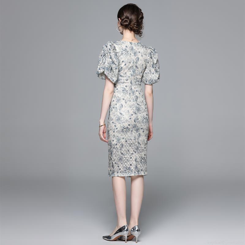 • Elegant French Style Floral Print Midi Dress For Women V-Neck Puff Short Sleeve Split Hem Mesh Waist Patchwork Polyester A-Line Dress Party Summer