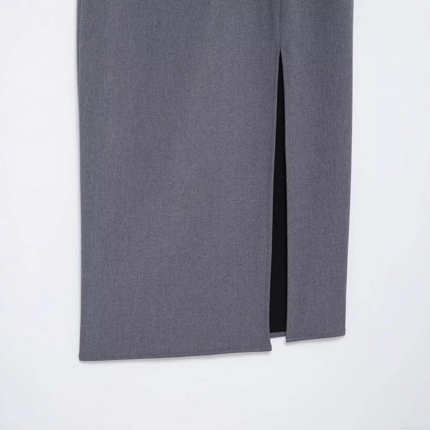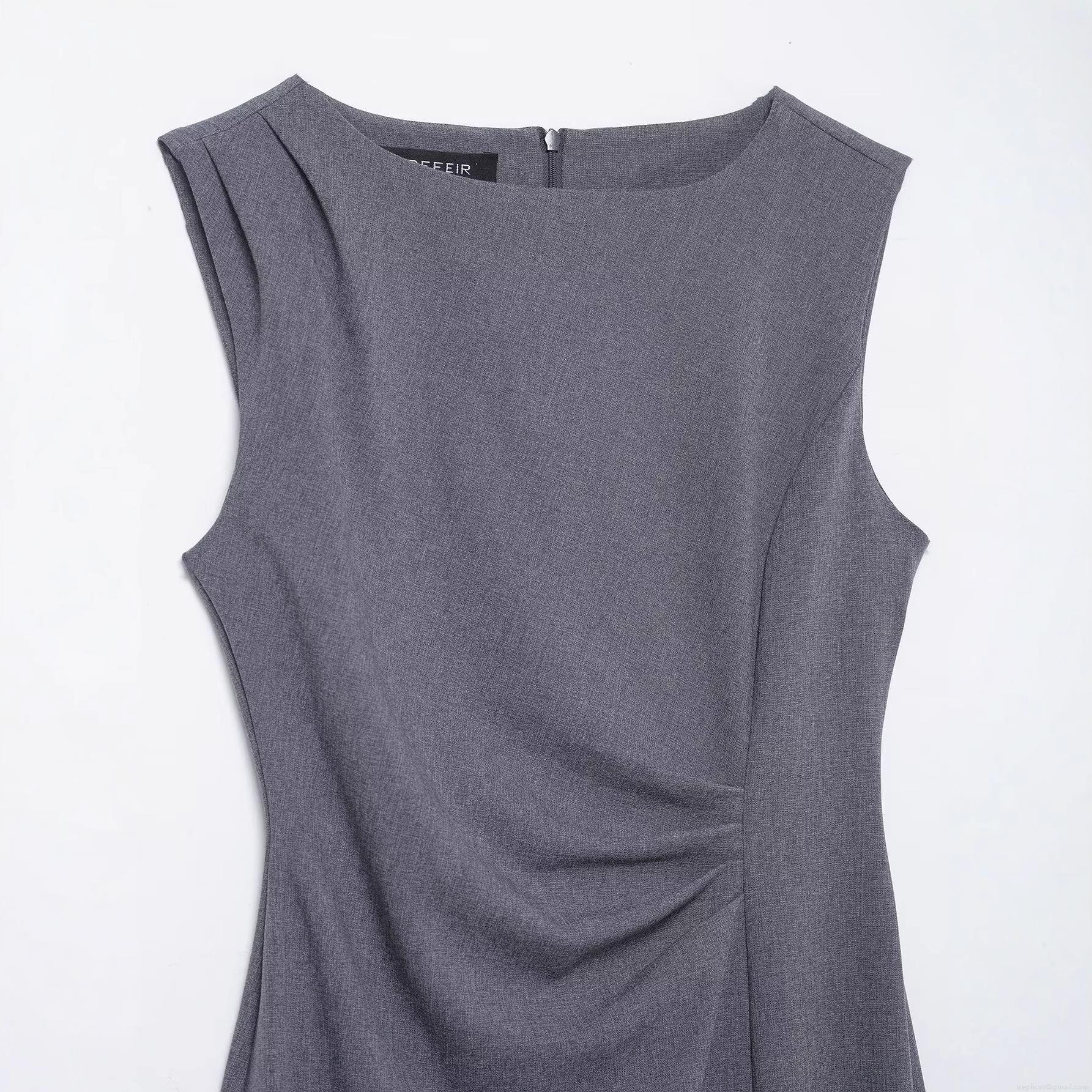 • Elegant Gray Sleeveless Midi Dress Polyester Blend Pleated Waist Side Slit Slim Fit Commuter Party Dress for Women