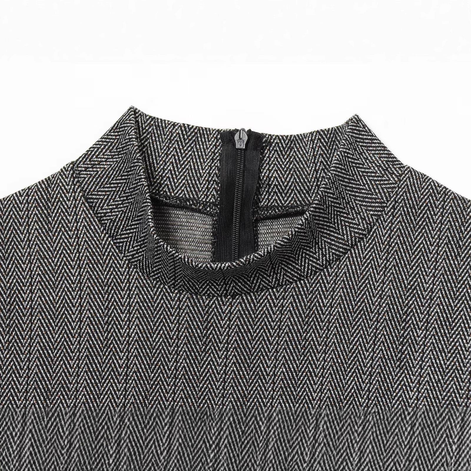 • Elegant Grey Herringbone Sleeveless Midi Dress With Belt Mock Neck Slim Fit Polyester Office Streetwear Casual Gown For Women