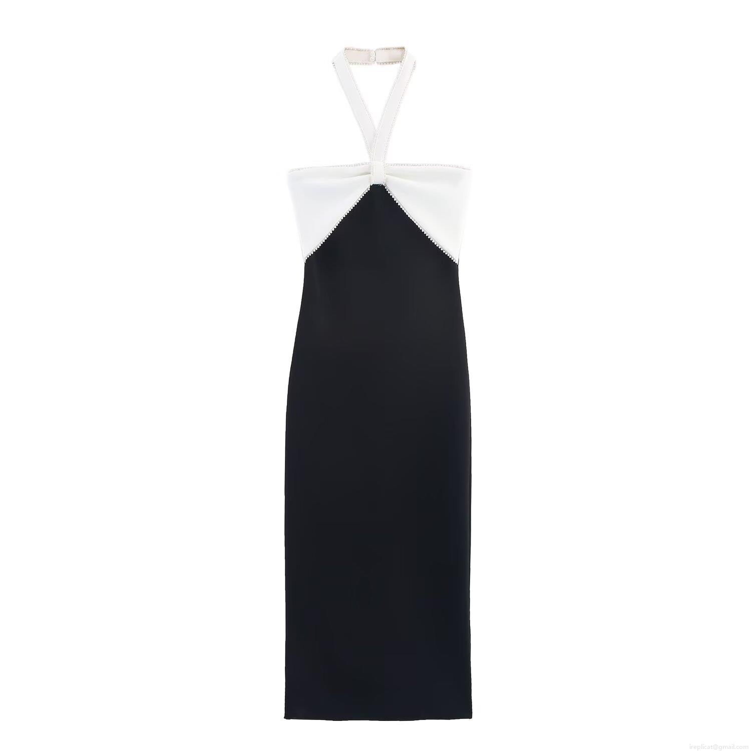 • Elegant Halter Neck Backless Midi Dress With Bow Decoration Contrast Color Slim Fit Polyester Spandex Pearl Evening Party Banquet Club Dress For Women