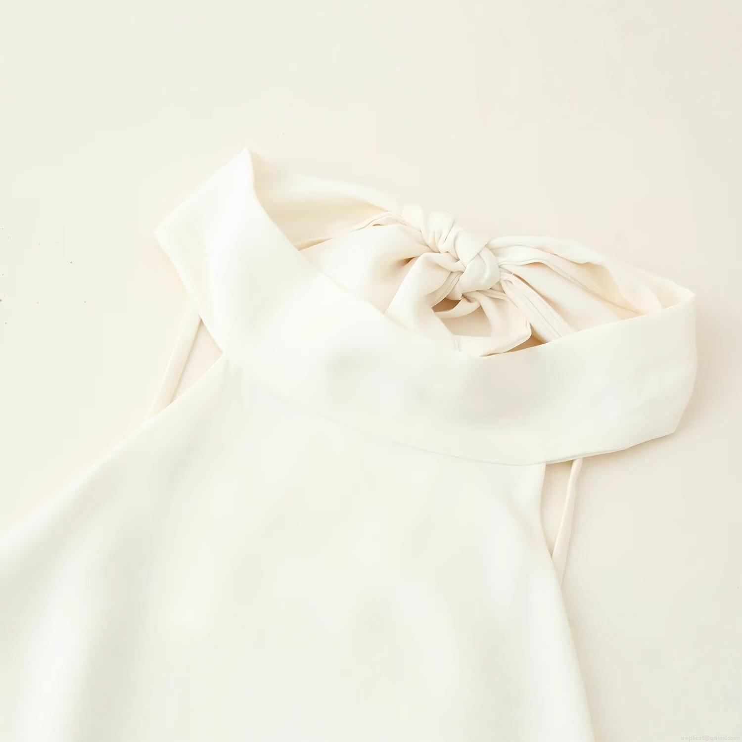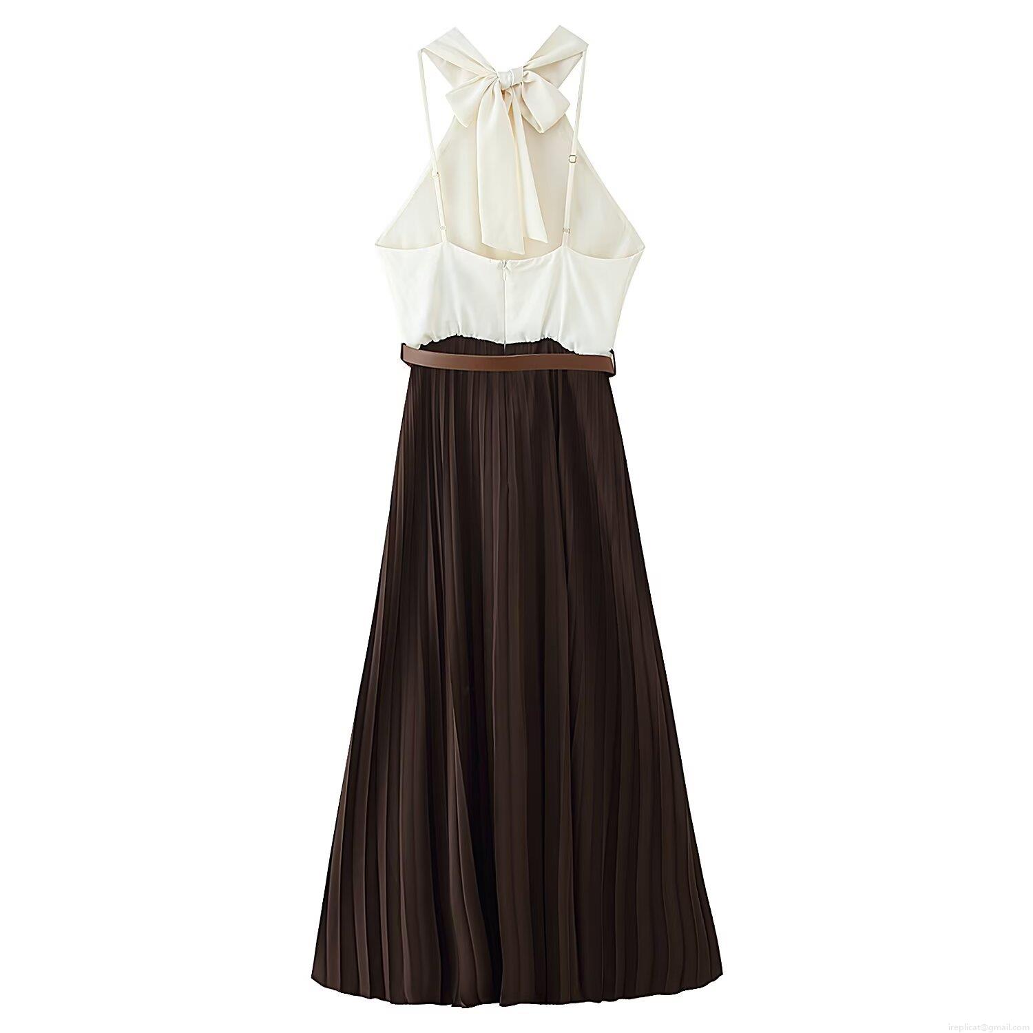 • Elegant Halter Neck Pleated Midi Dress Contrast Color Sleeveless Back Bow Polyester Satin Socialite Summer Party Banquet Dress With Leather Belt
