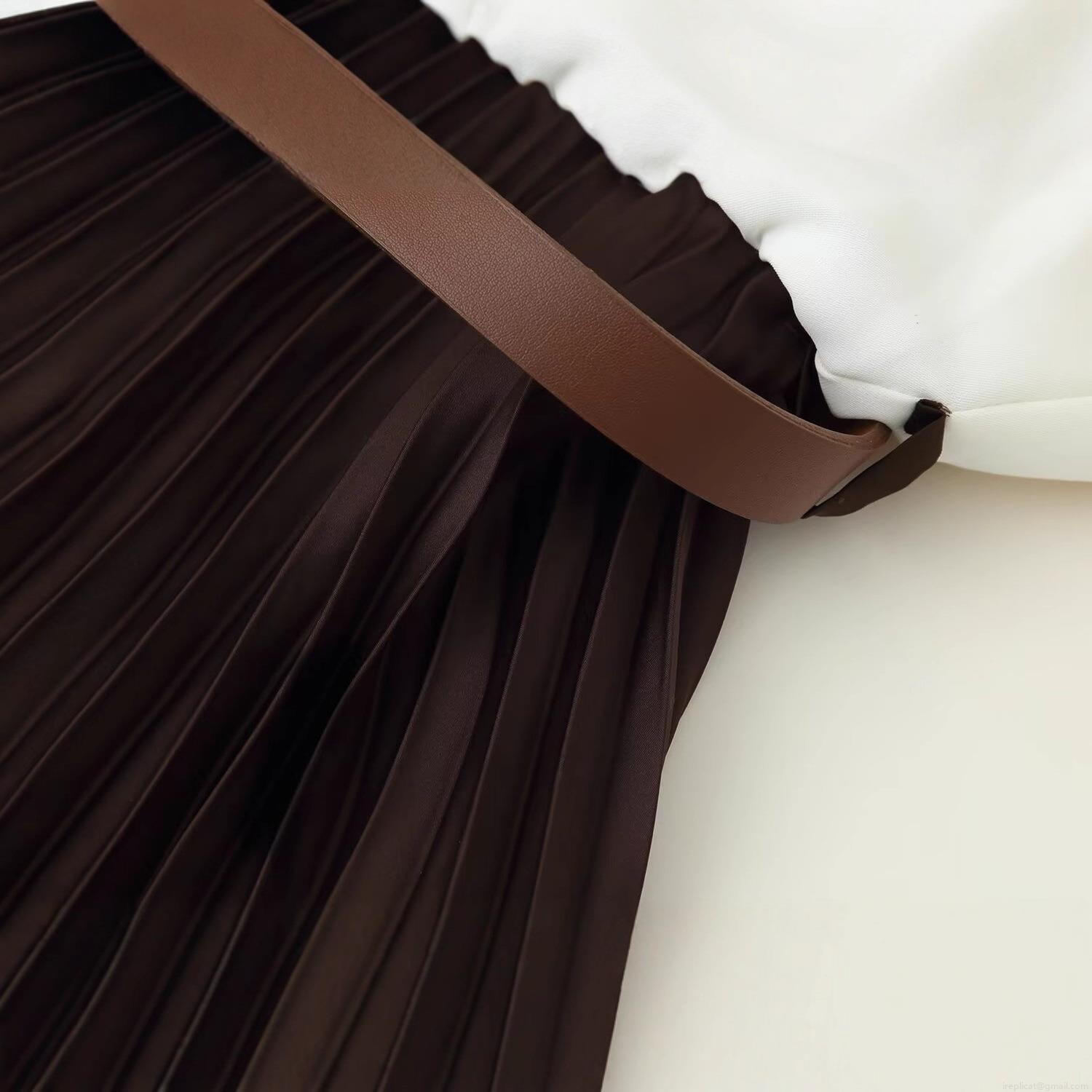 Elegant Halter Neck Pleated Midi Dress Contrast Color Sleeveless Back Bow Polyester Satin Socialite Summer Party Banquet Dress With Leather Belt