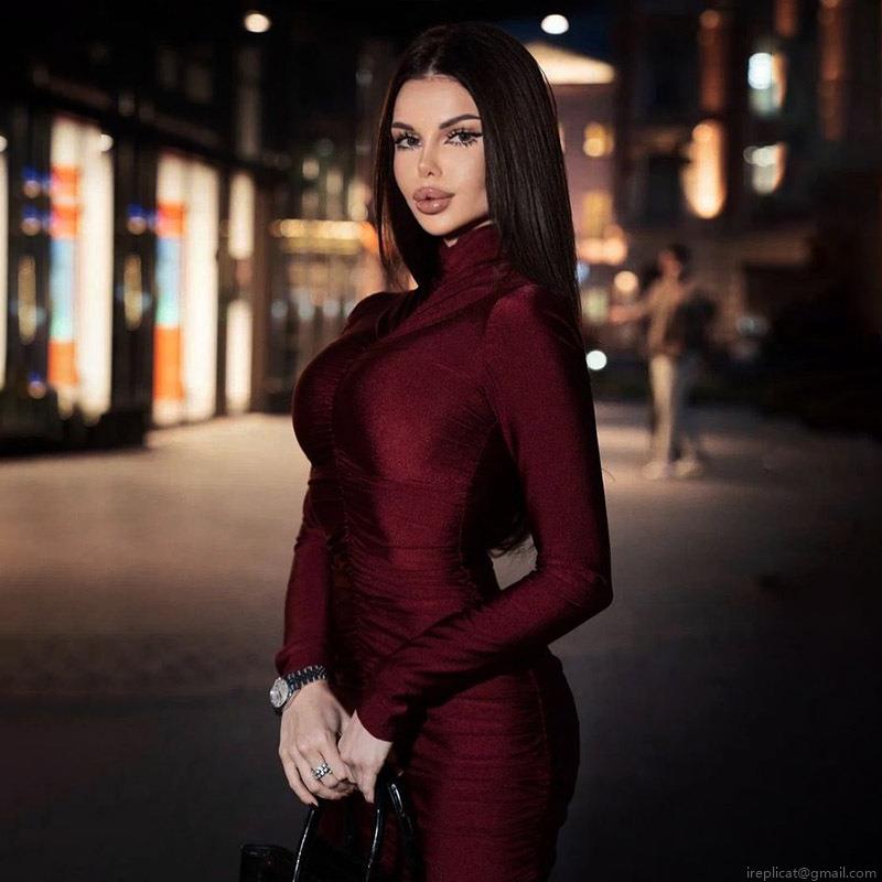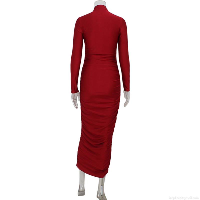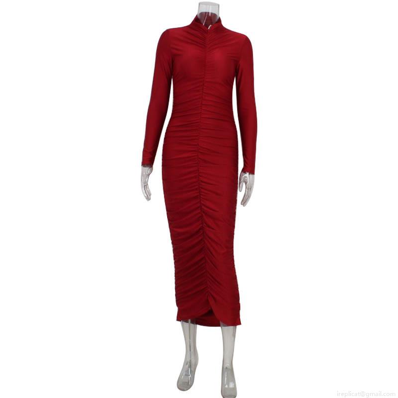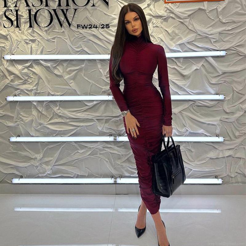 • Elegant High Neck Long Sleeve Ruched Bodycon Dress For Women Sexy Solid Color Slim Fit Maxi Dress For Party Evening Date