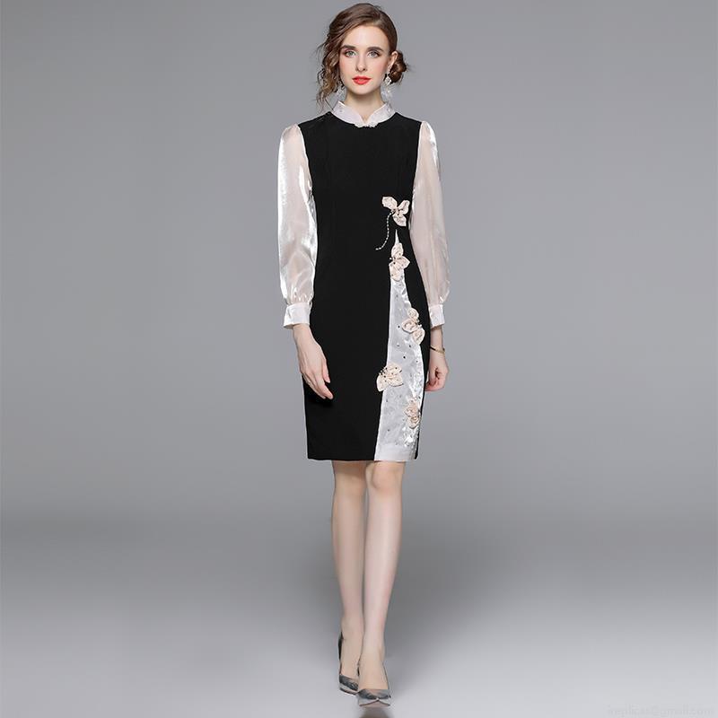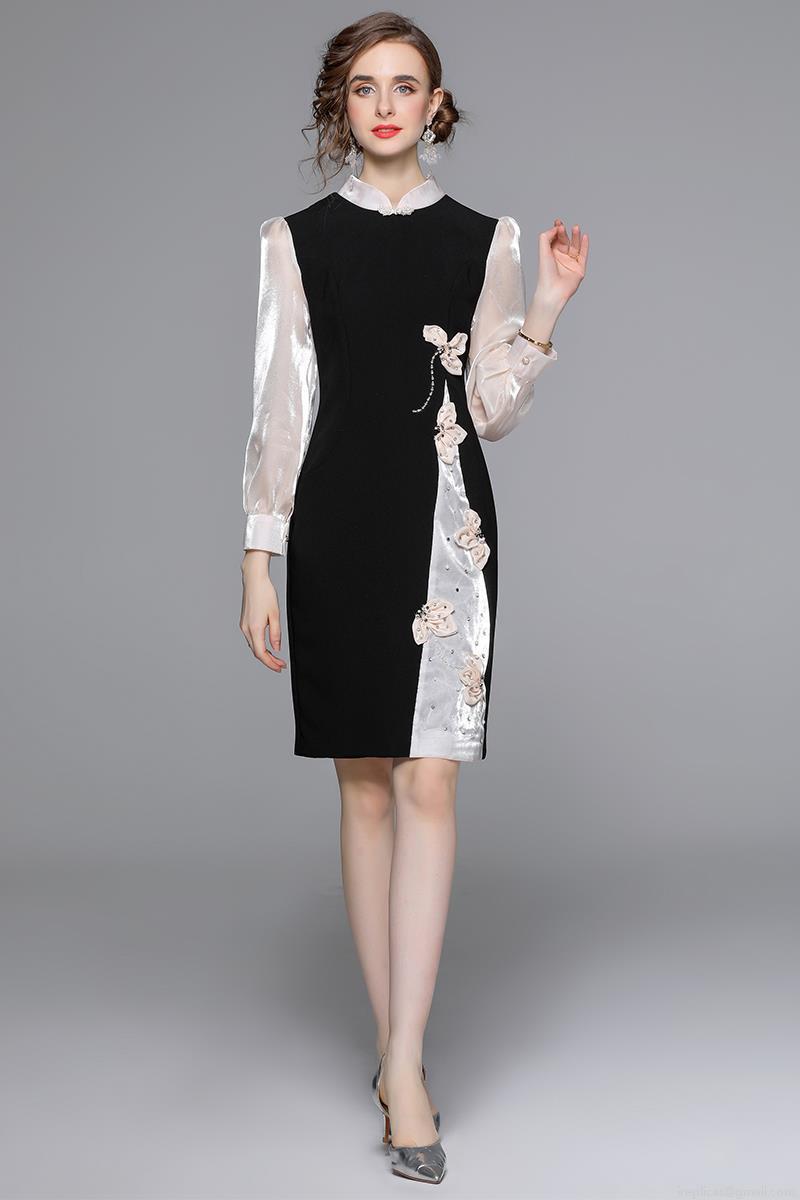 Elegant Improved Qipao Patchwork Dress Women Stand Collar Long Sleeve Satin Chiffon Embroidery 3D Flower Socialite Slim Fit Midi Dress For Wedding Party