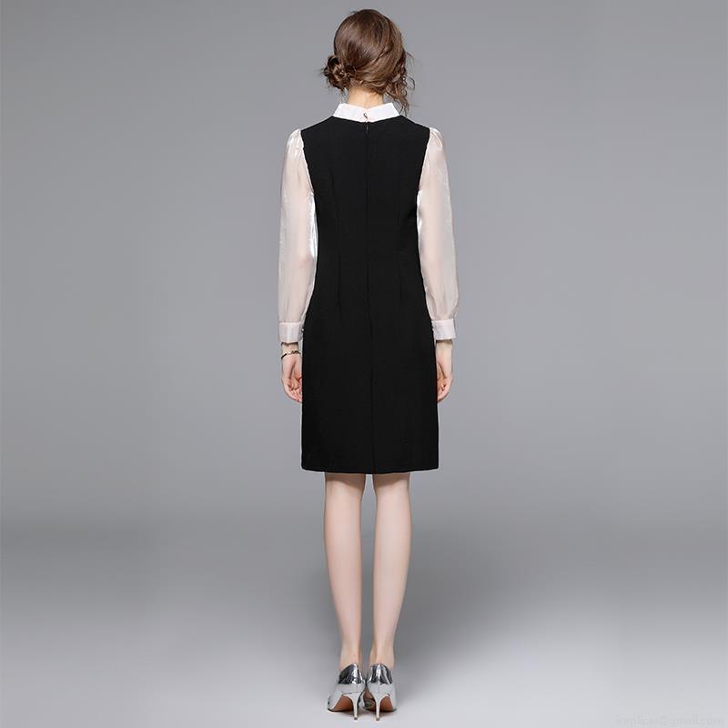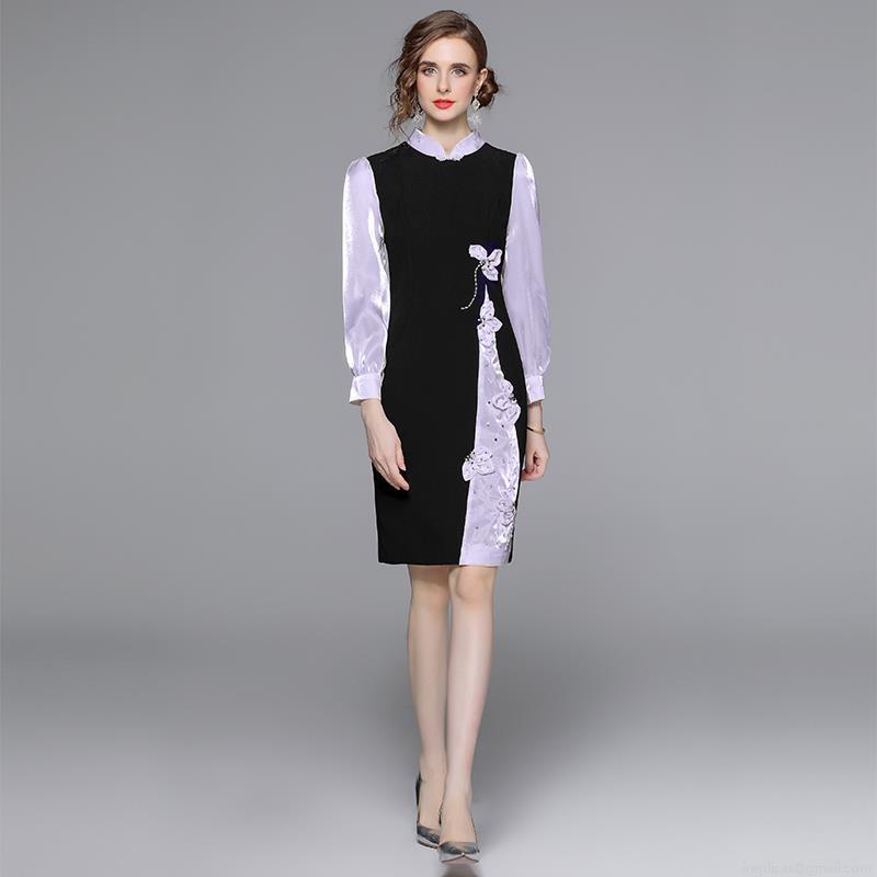 • Elegant Improved Qipao Patchwork Dress Women Stand Collar Long Sleeve Satin Chiffon Embroidery 3D Flower Socialite Slim Fit Midi Dress For Wedding Party