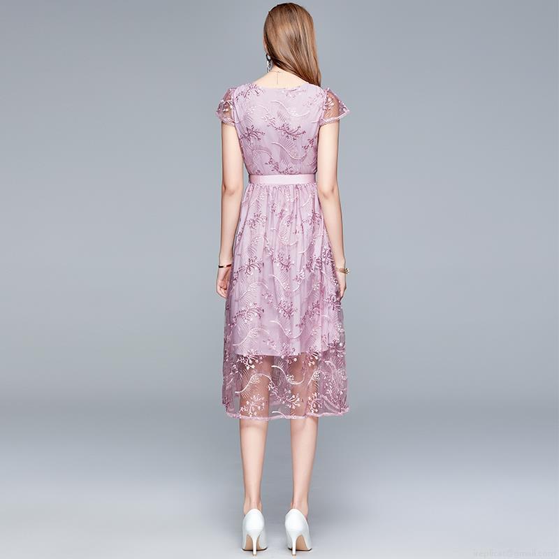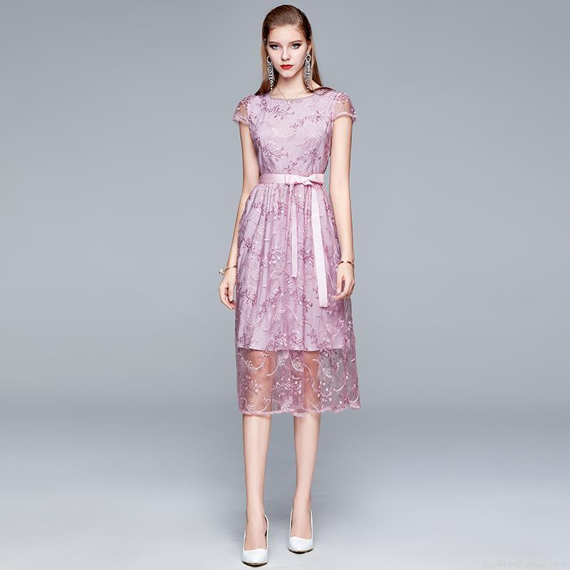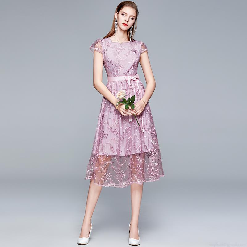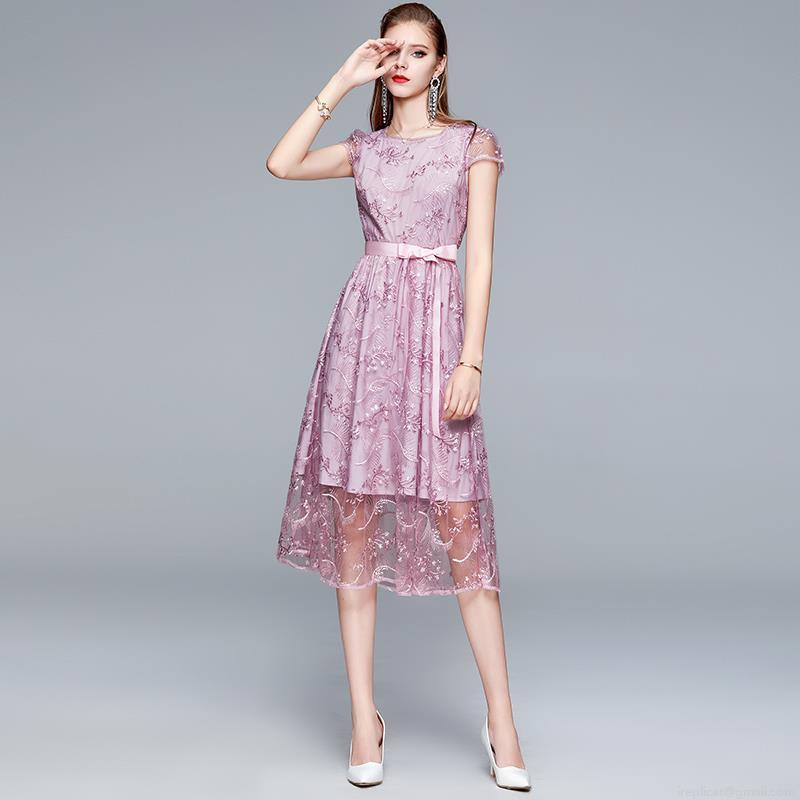 Elegant Mesh Lace Embroidery Midi Dress Women Round Neck Short Sleeve Bowtie Waist Slim Fit Party Evening Wedding Guest Prom Dresses