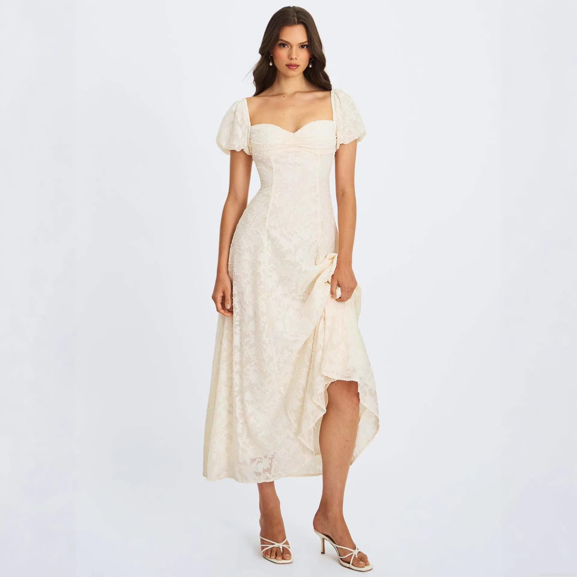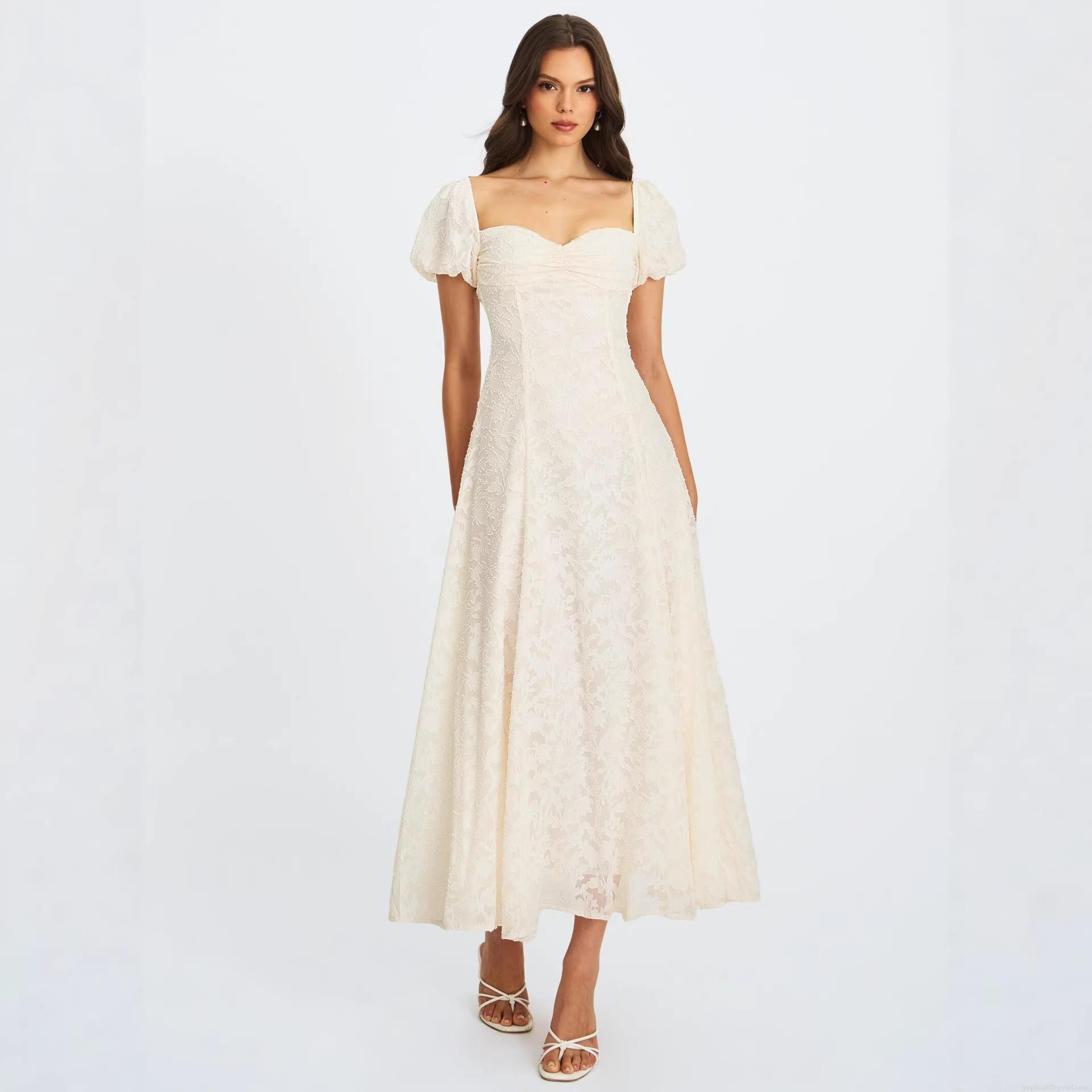 • Elegant Milk White Burnout Floral Lace Midi Dress Backless Cross Straps Puff Sleeve A-Line Party Dress For Women Hepburn Style Evening Gown