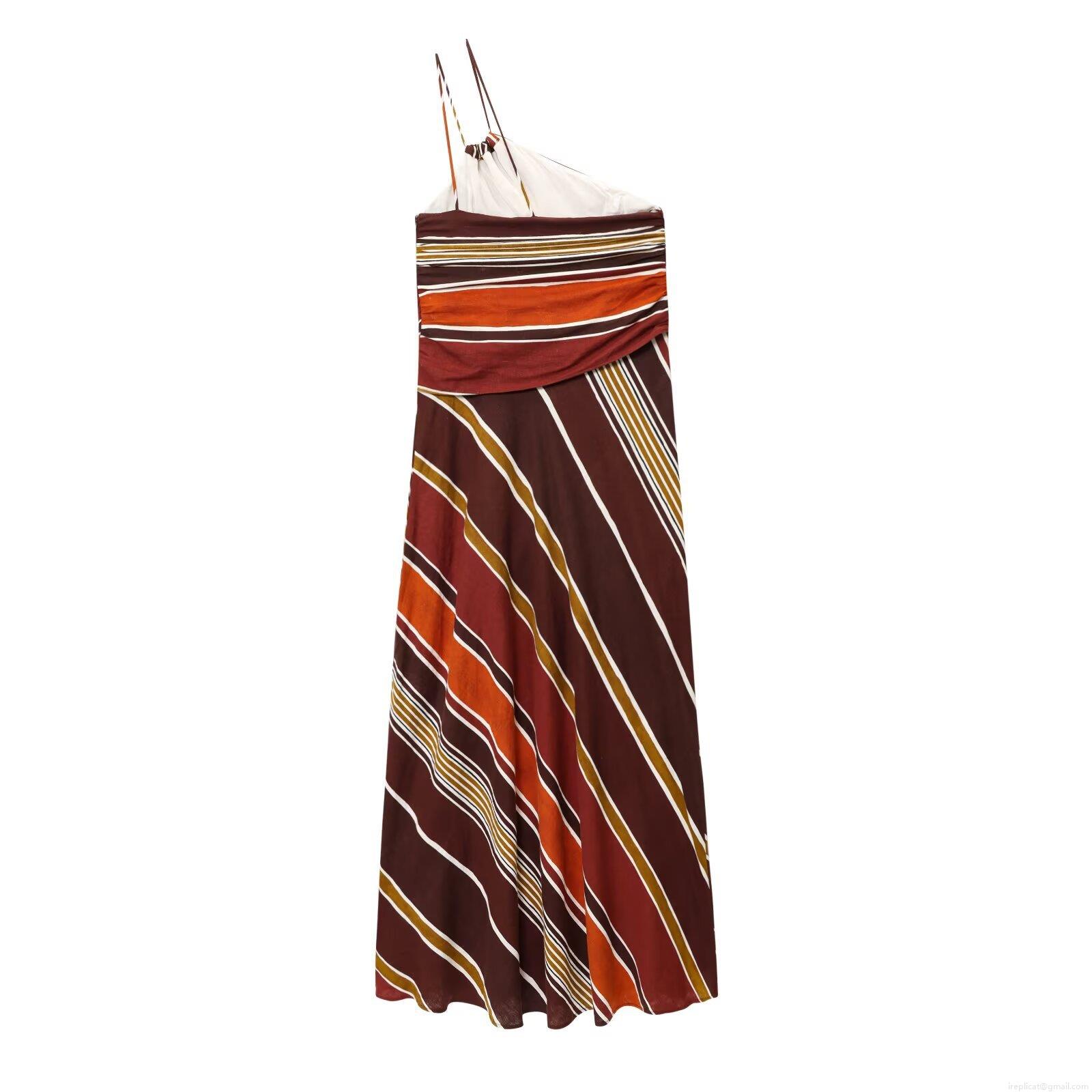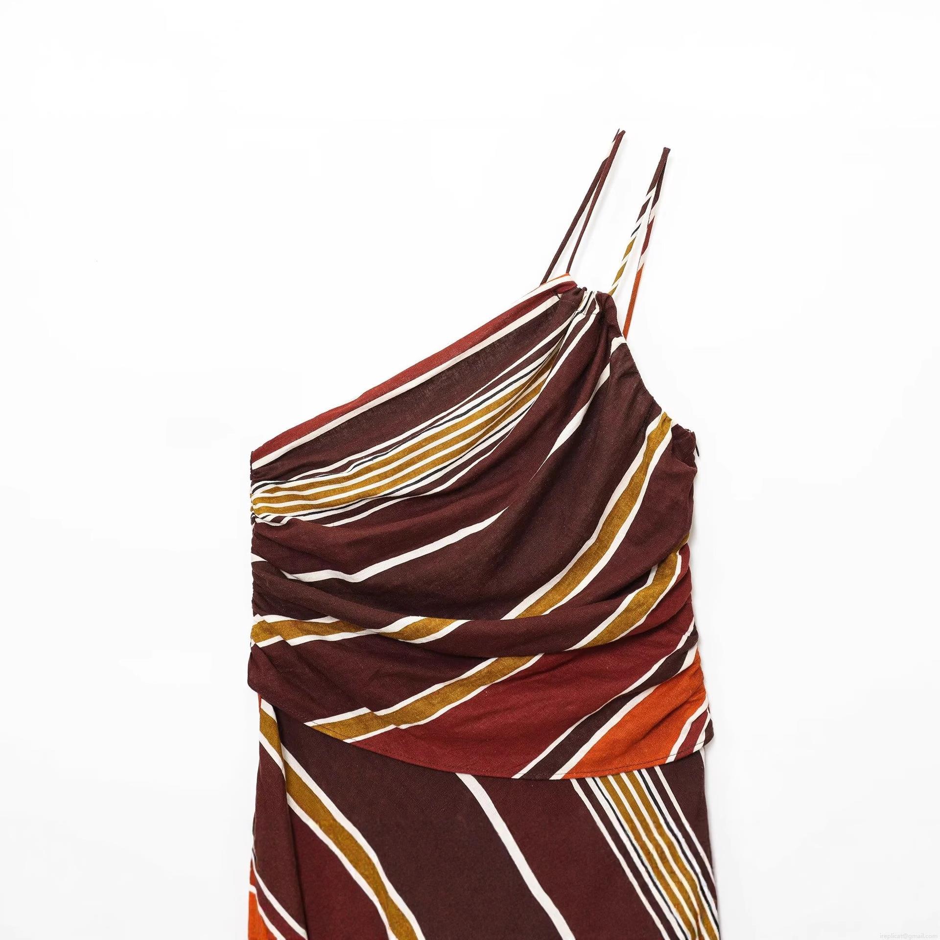 • Elegant One Shoulder Asymmetrical Midi Dress Brown Orange Striped Sleeveless Pleated Waist Polyester Linen Party Evening Dress For Women