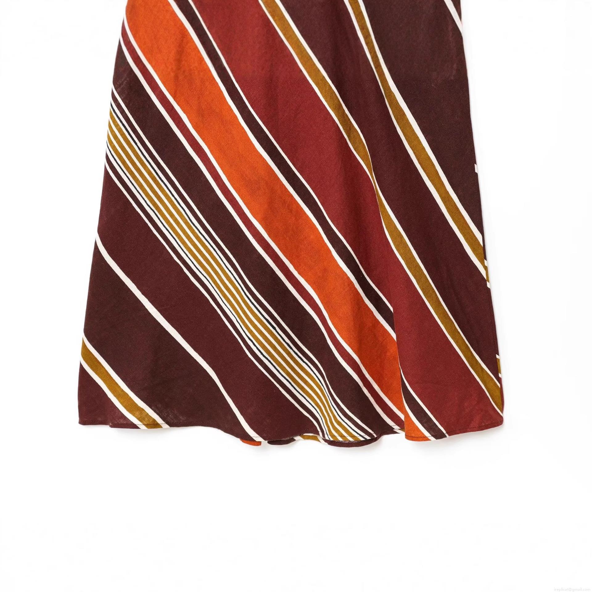 Elegant One Shoulder Asymmetrical Midi Dress Brown Orange Striped Sleeveless Pleated Waist Polyester Linen Party Evening Dress For Women