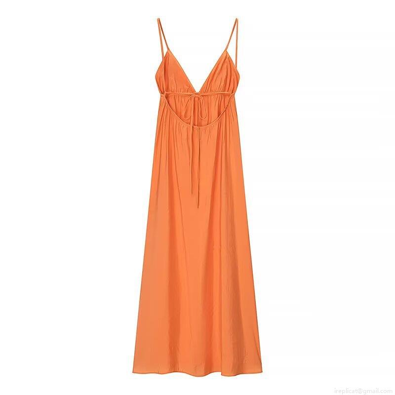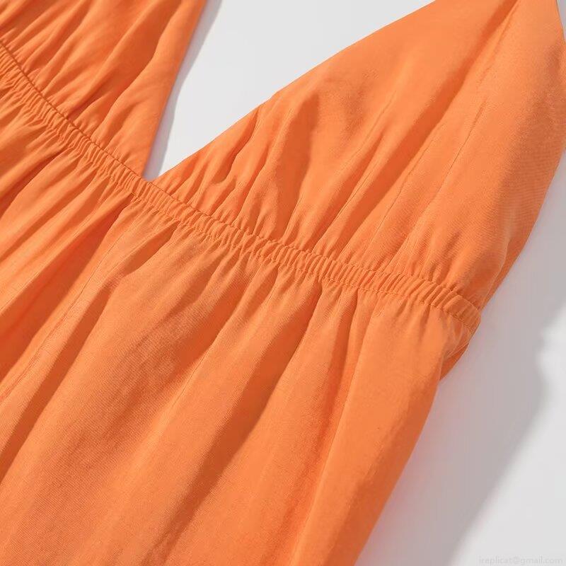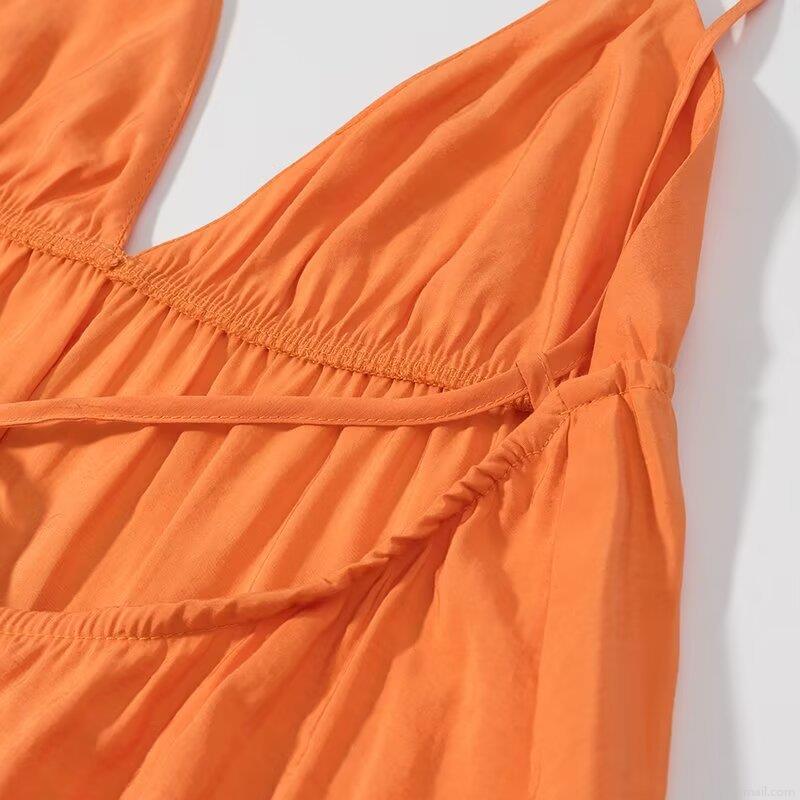 • Elegant Orange Polyester Spaghetti Strap Dress For Women Summer V-Neck Backless Midi Maxi Dress Solid Color Sleeveless Flowy Beach Party Sundress