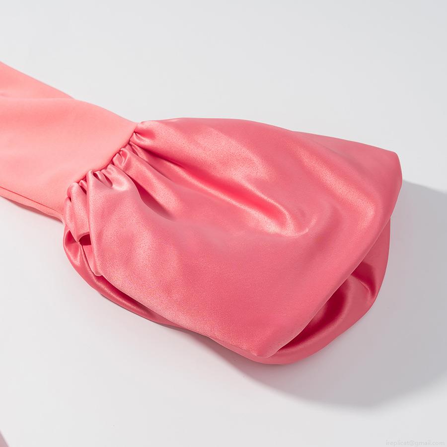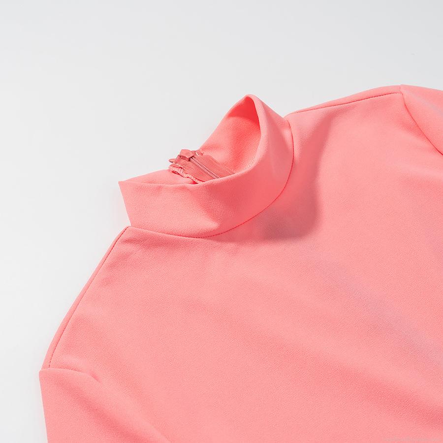 • Elegant Peach Pink Polyester Satin Women's Long Sleeve Dress With Stand Collar Bell Sleeves Bodycon Back Split Midi Dress For Party Club Evening Chic