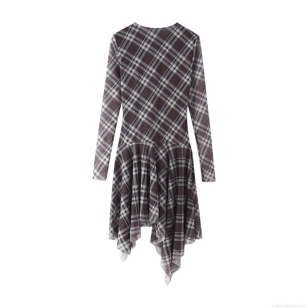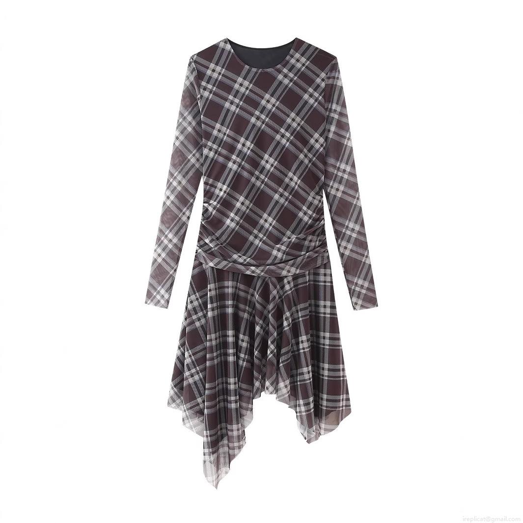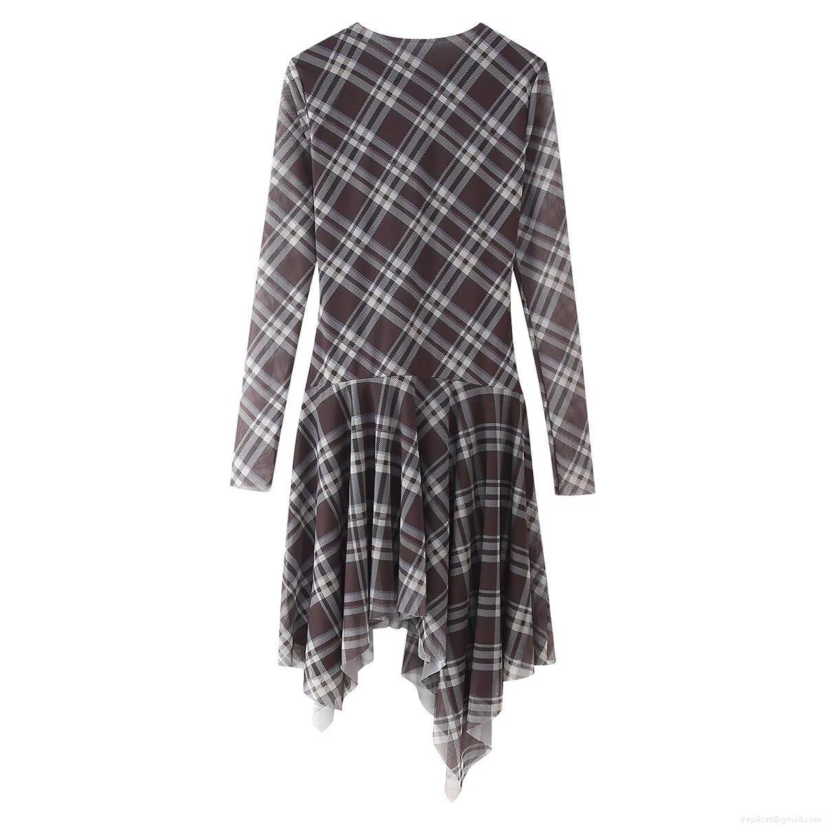 • Elegant Plaid Mesh Long Sleeve Midi Dress With Asymmetrical Ruched Hem Round Neck Slim Fit Bodycon Dress For Women Party Daily Wear