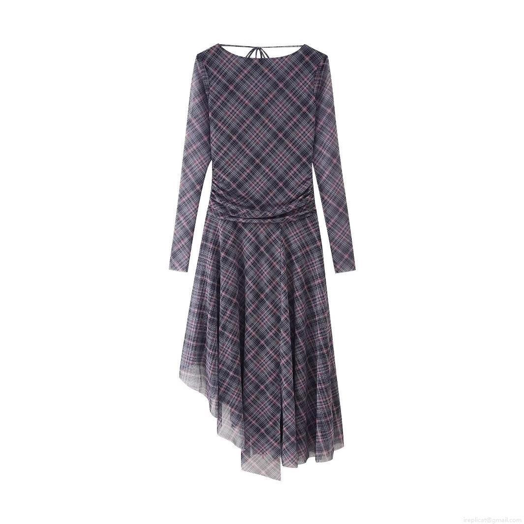 • Elegant Plaid Mesh Ruched Midi Dress For Women Long Sleeve V-Neck Back Tie Asymmetric Hem Vintage Socialite Style Evening Party Polyester Dress