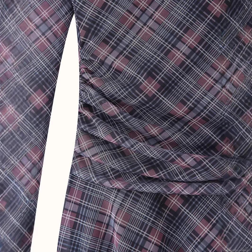 Elegant Plaid Mesh Ruched Midi Dress For Women Long Sleeve V-Neck Back Tie Asymmetric Hem Vintage Socialite Style Evening Party Polyester Dress