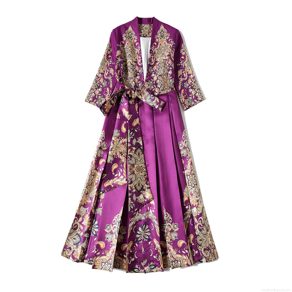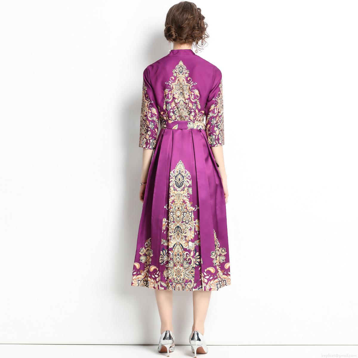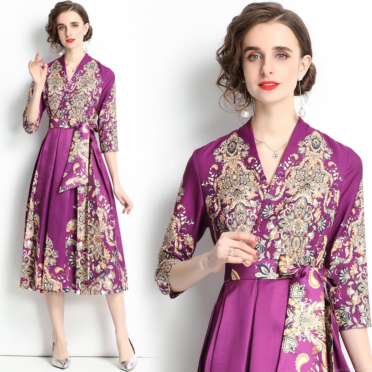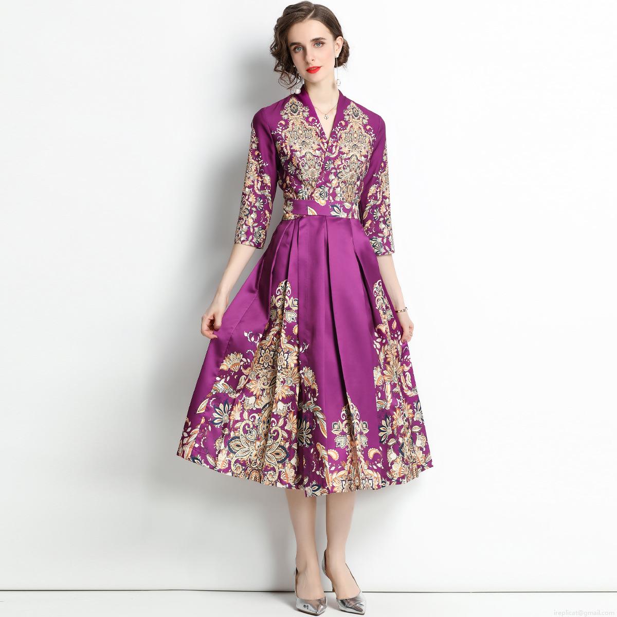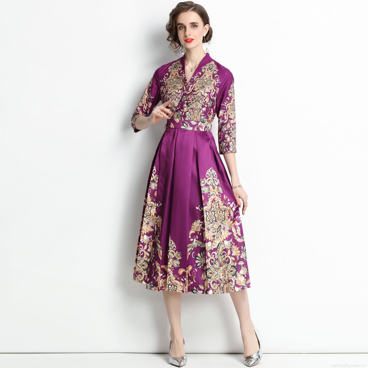• Elegant Purple Palace Style Paisley Print V-Neck Midi Dress French Retro Women 3/4 Sleeve Satin Finish High Waist Slimming Party Dress For Wedding Guest Dinner Lady