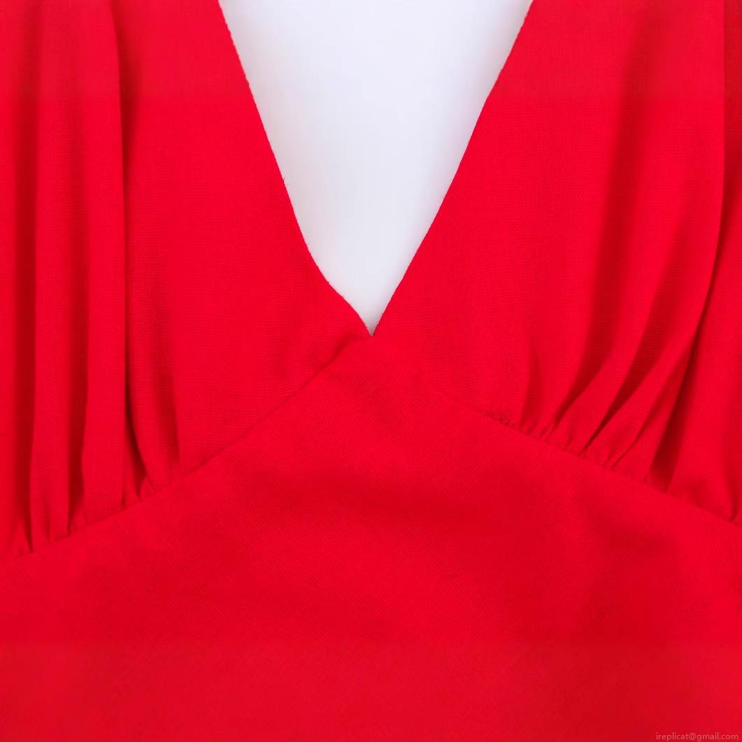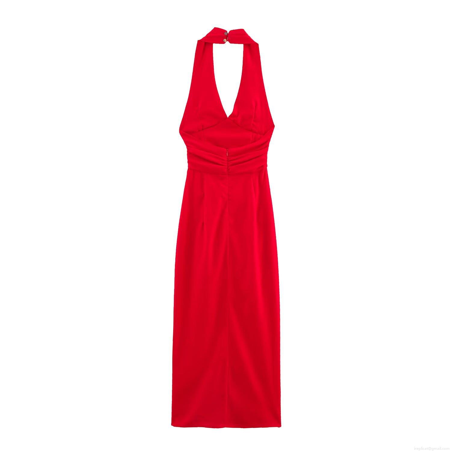 • Elegant Red Halter Neck Midi Dress Polyester V-Neck Sleeveless Ruched Side Slit Backless Evening Party Dress For Women