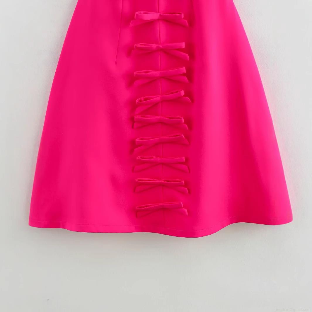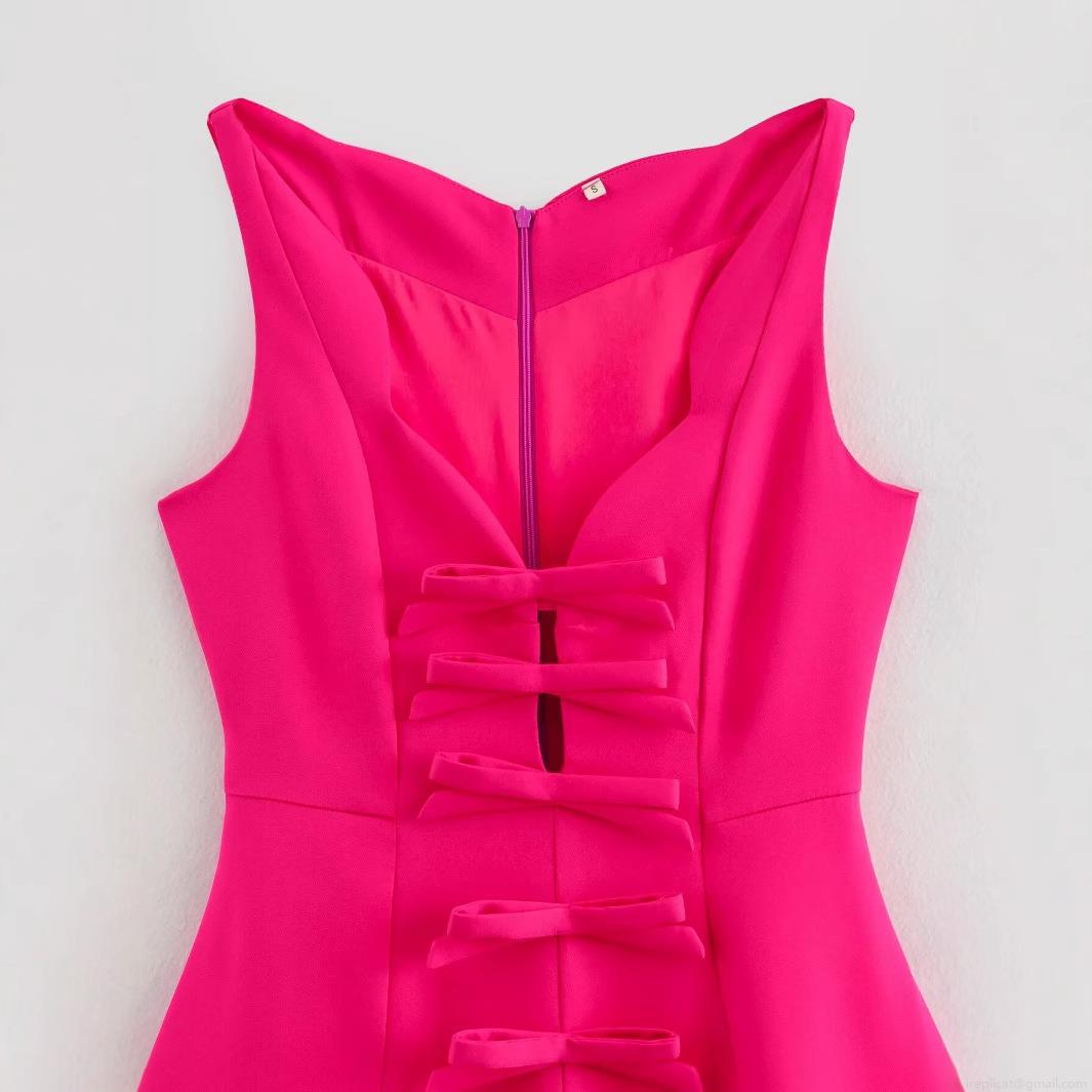 • Elegant Rose Red Sleeveless A-Line Long Dress With Bow Knots V-Neck Polyester Streetwear Party Midi Dresses For Women