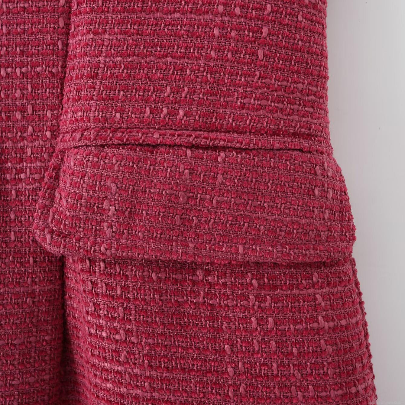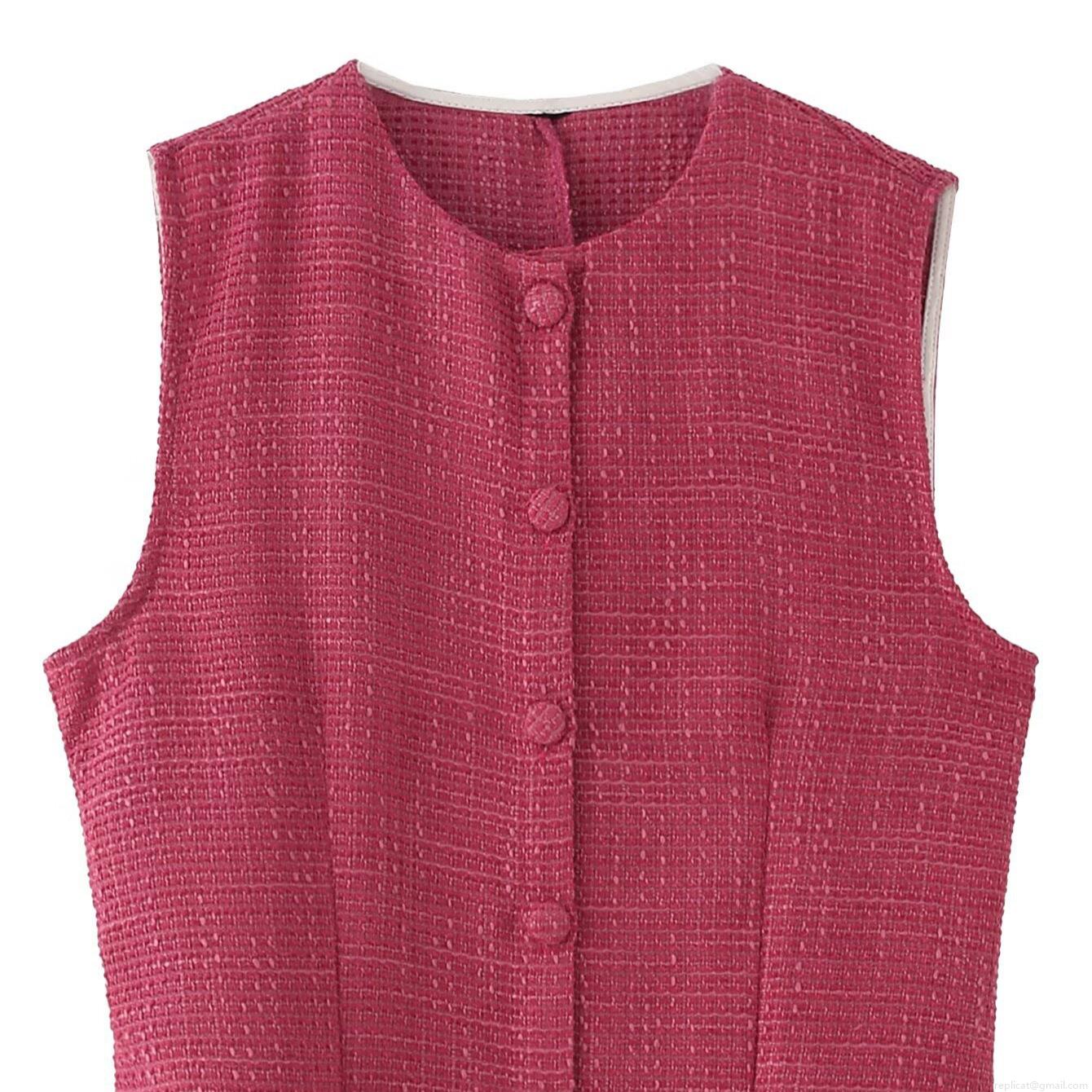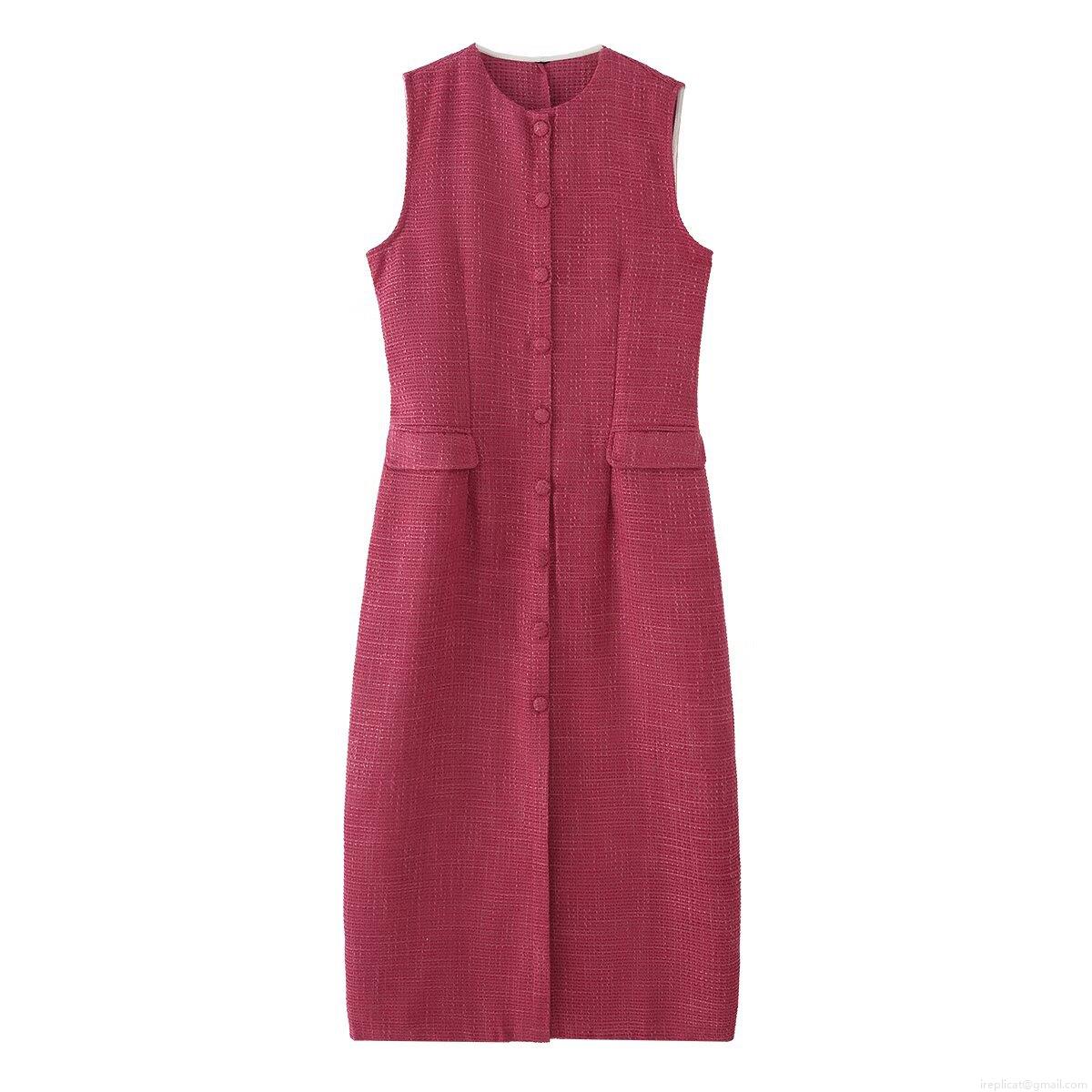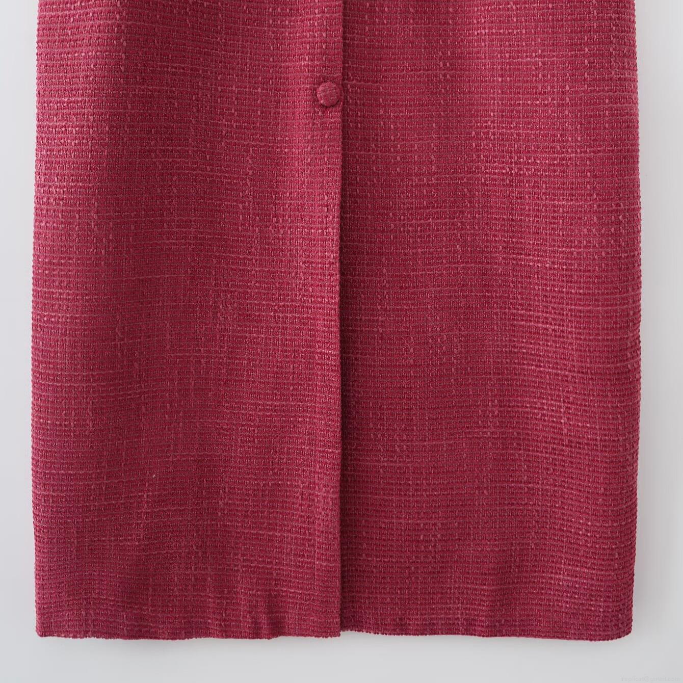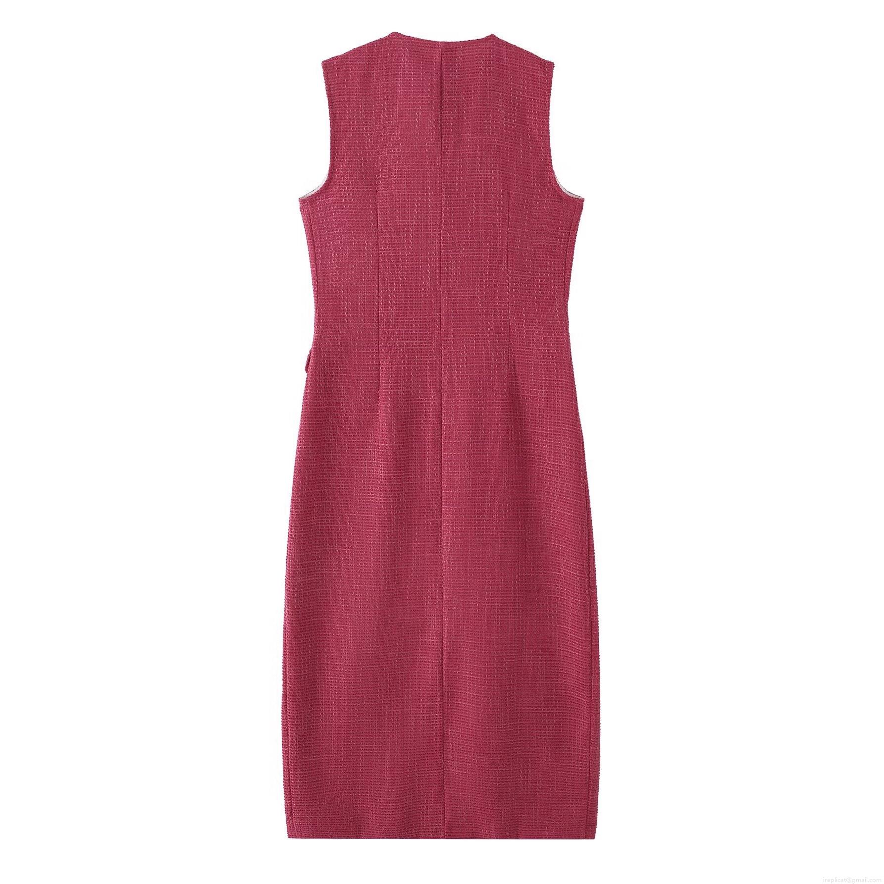 • Elegant Rose Red Tweed Sleeveless Midi Dress For Women V-Neck Single Breasted Waist Slimming Fashion Tweed Dress For Office Party Daily Wear