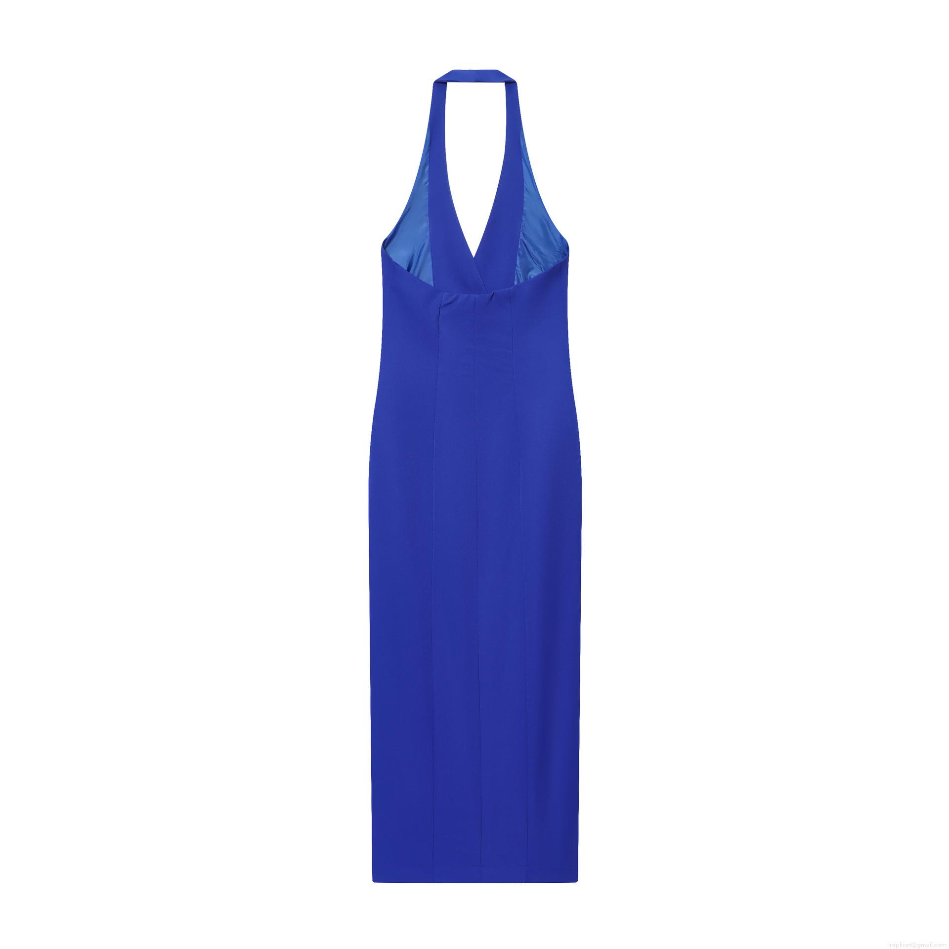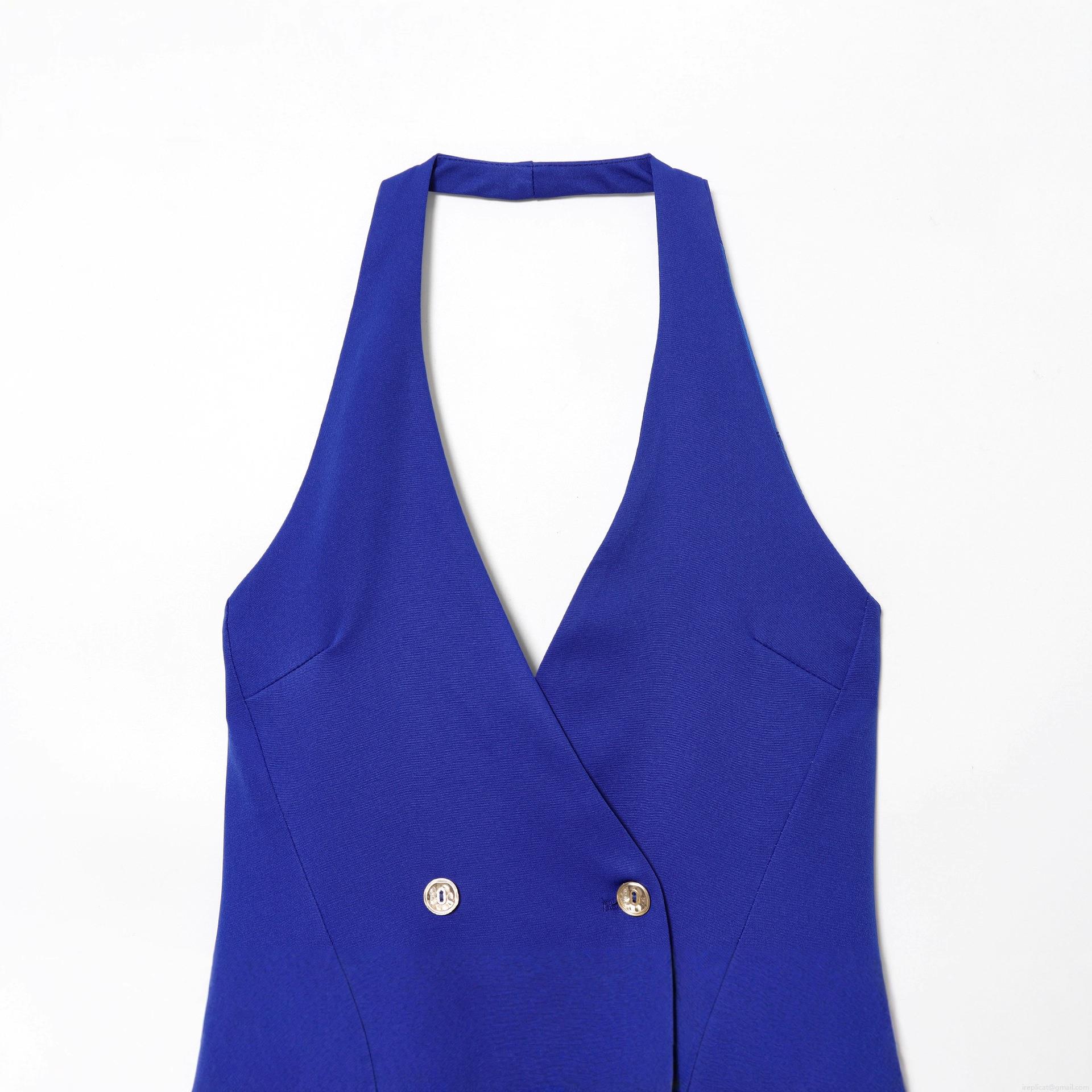 • Elegant Royal Blue Halter Neck Suit Dress Women Sexy Backless Double Breasted Gold Button Midi Crossover Party Dresses Slim Fit Clubwear Evening Dress