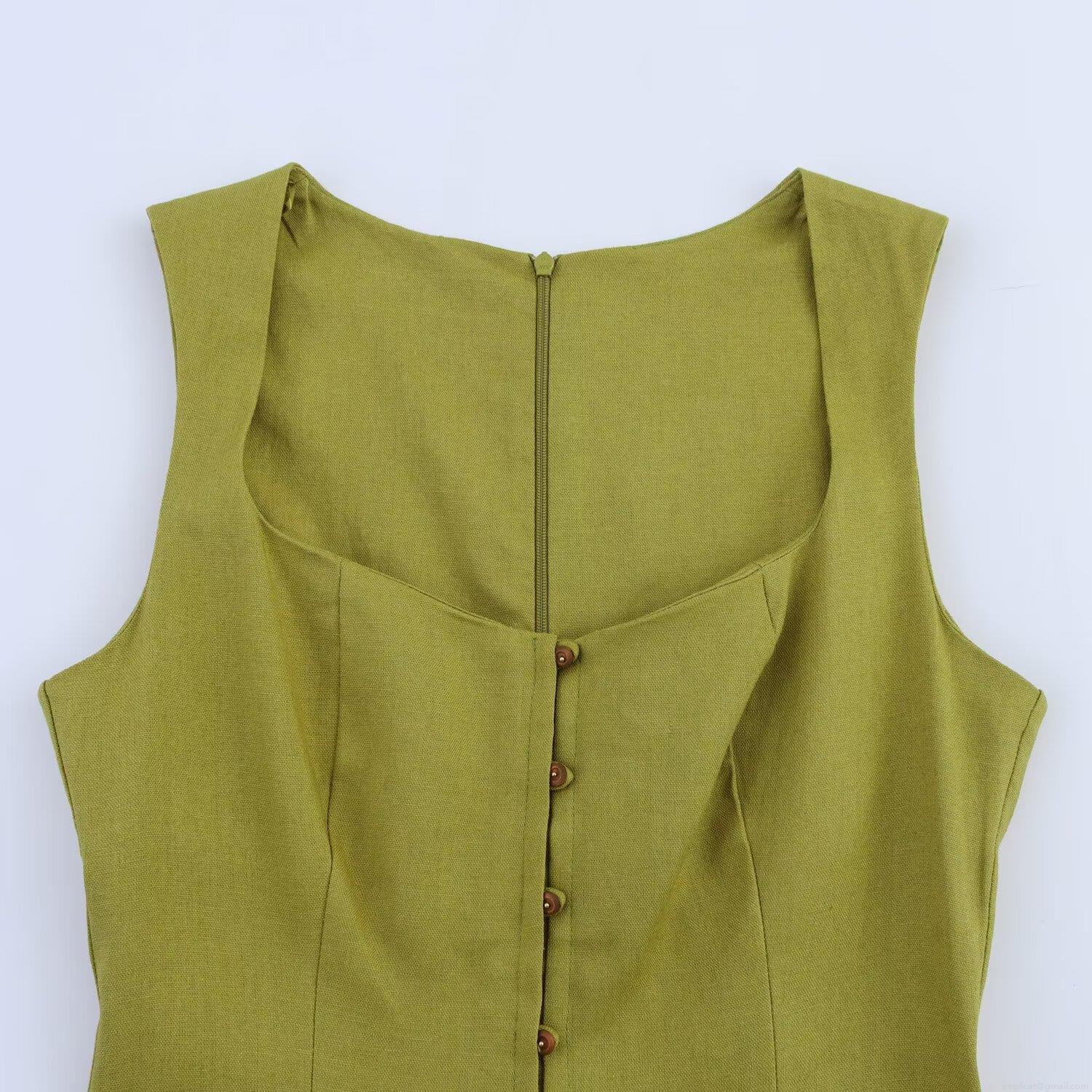 • Elegant Sleeveless Midi Dress Linen Cotton Square Neck Single Breasted Buttons Slit Hem French Vintage Style Summer Outfits For Women