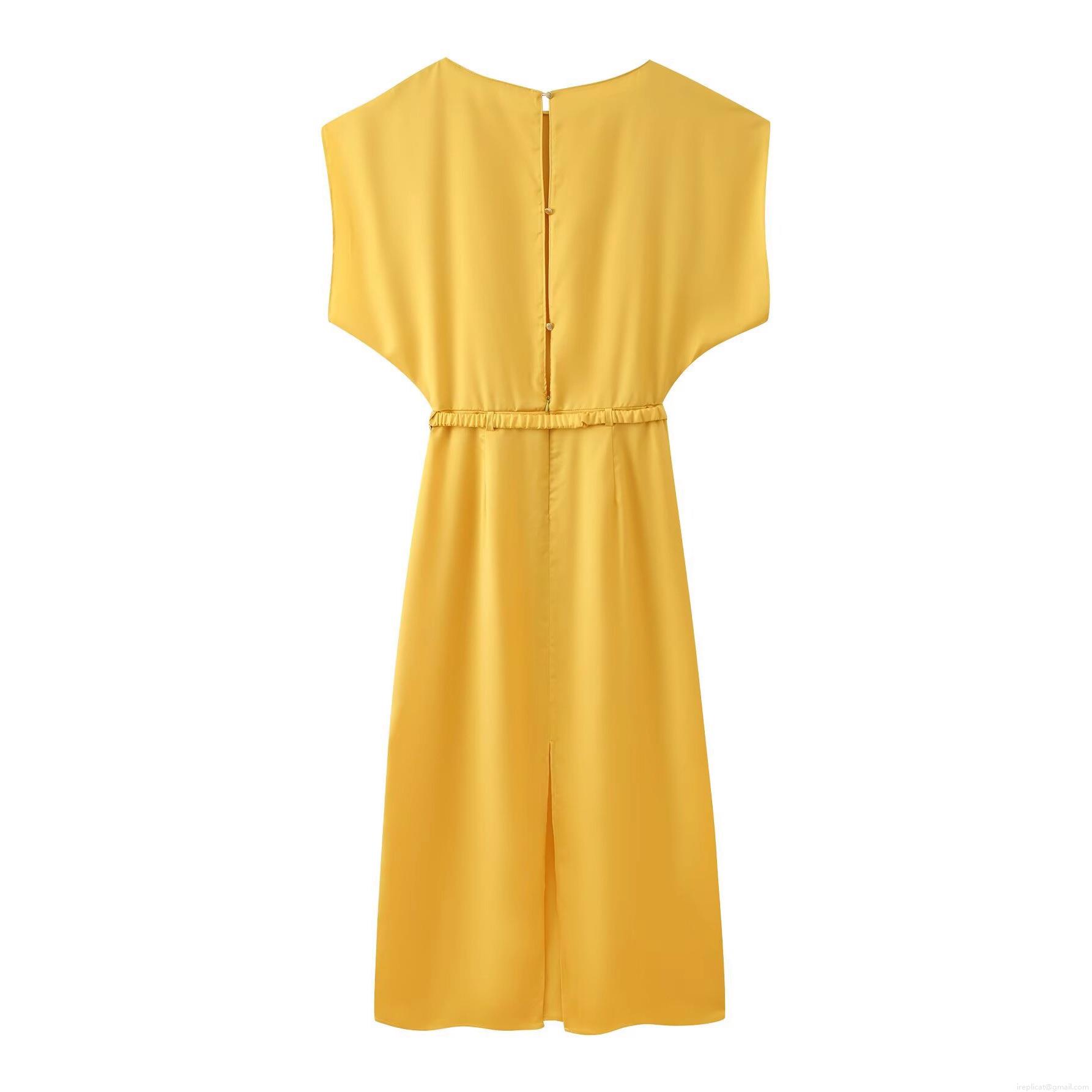 • Elegant Sleeveless Satin Midi Dress for Women Round Neck A-Line Solid Color Polyester Spandex Dress with Belt for Autumn Casual Party Wedding Guest
