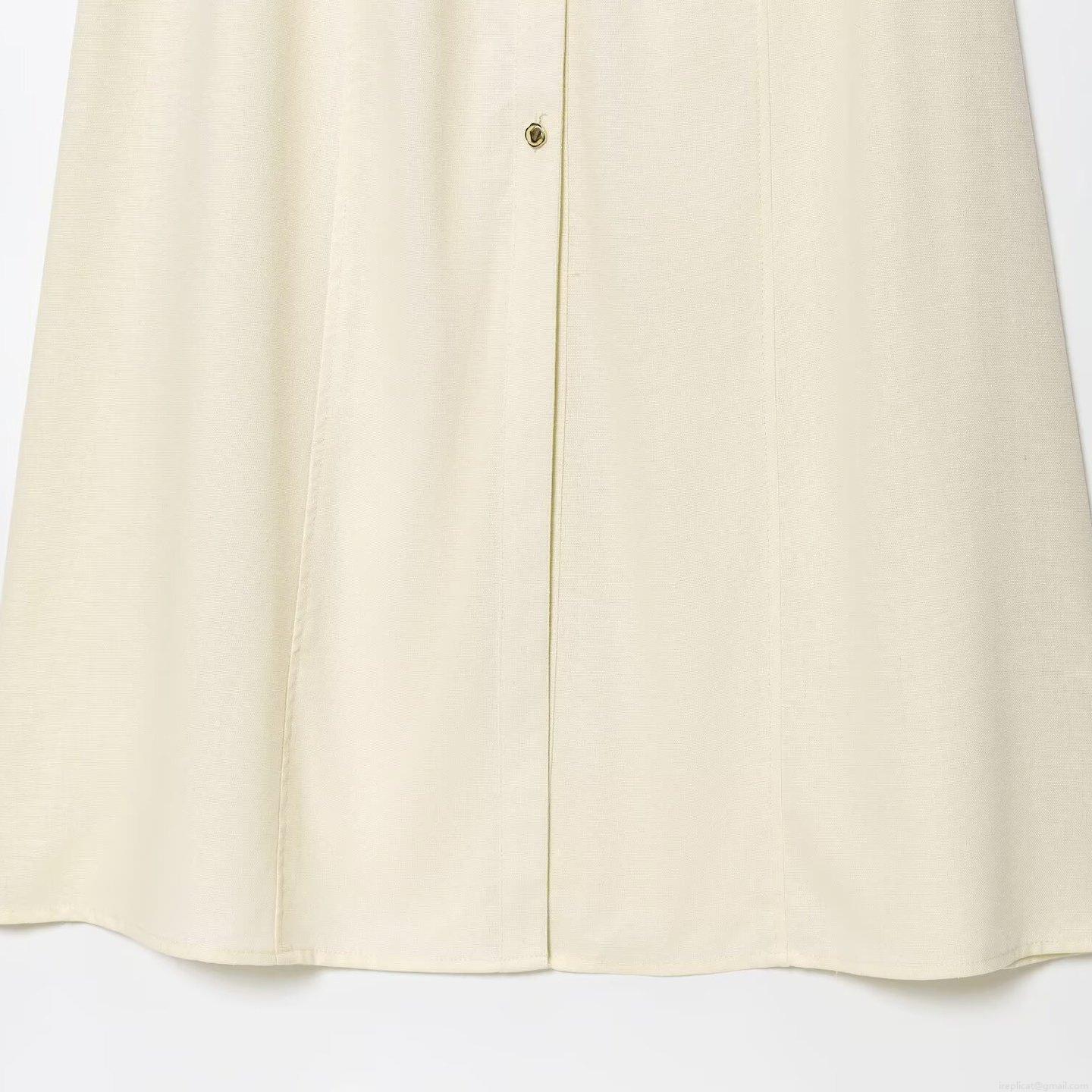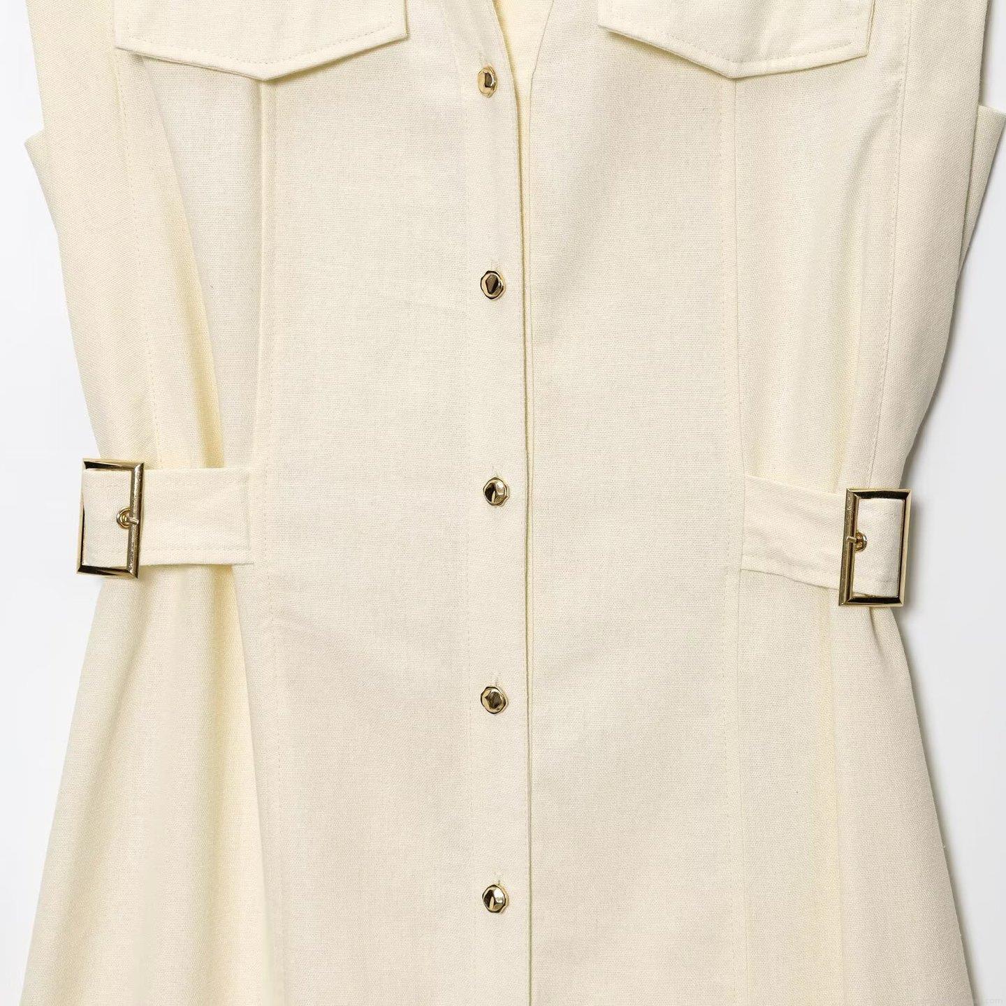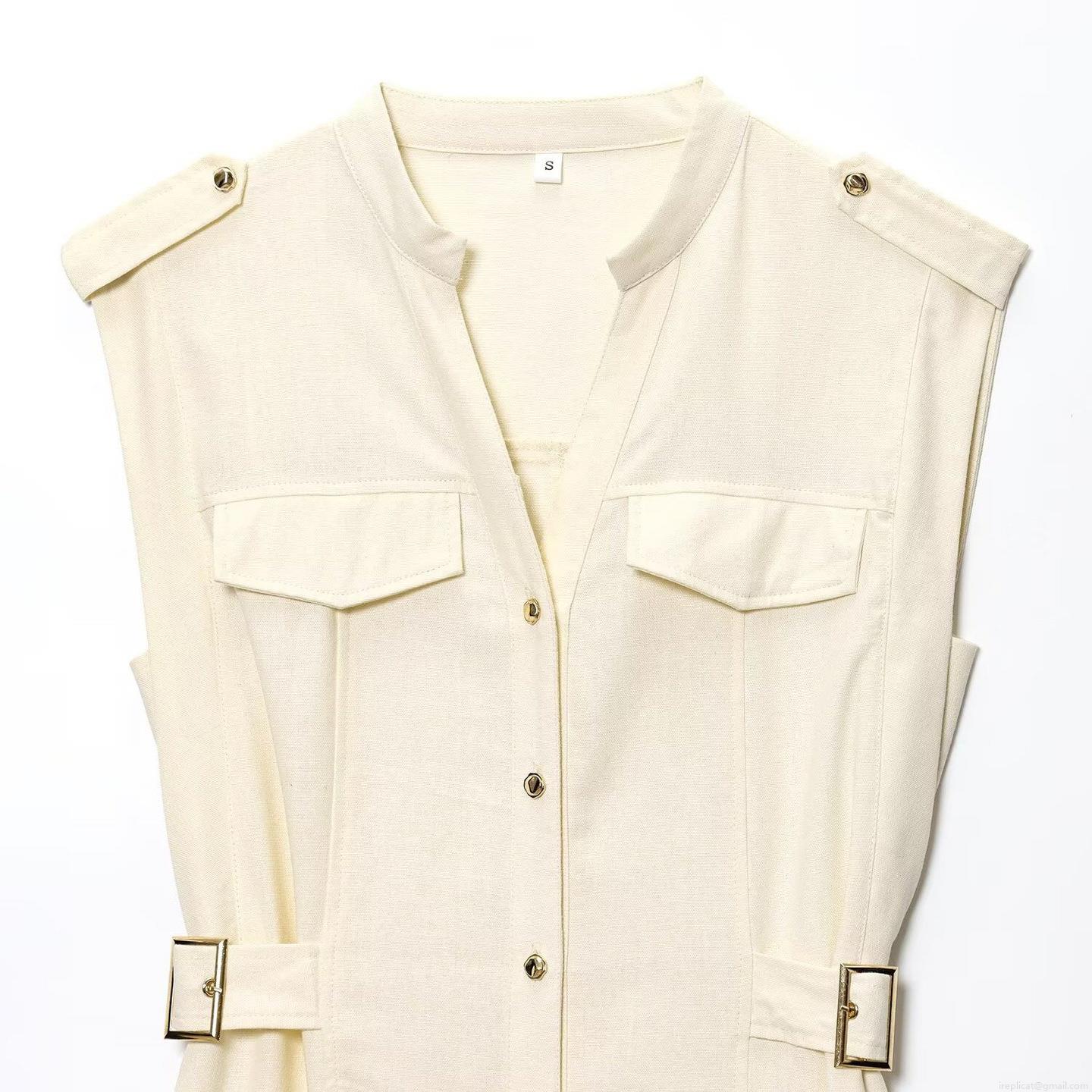 • Elegant Sleeveless V-Neck Midi Dress Cotton Linen Solid Color Button Cinch Waist Summer Commuting A-Line Dress For Women