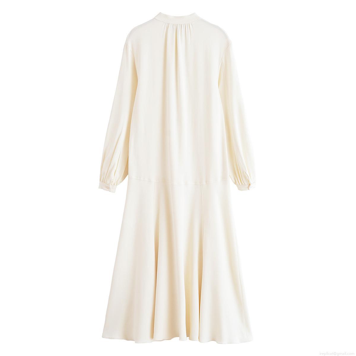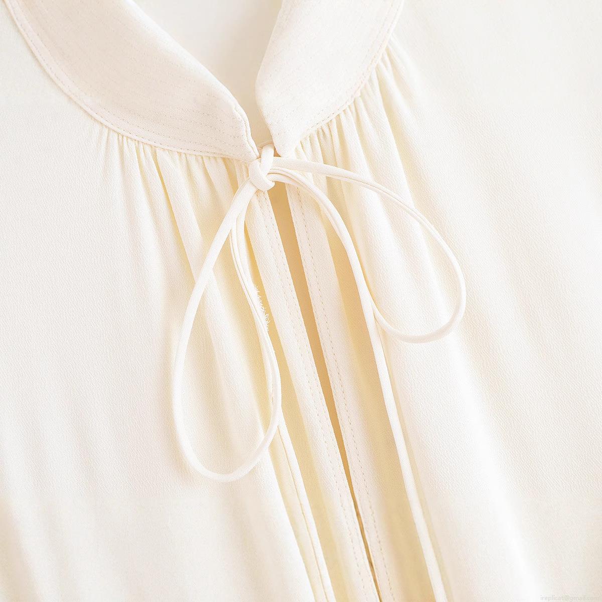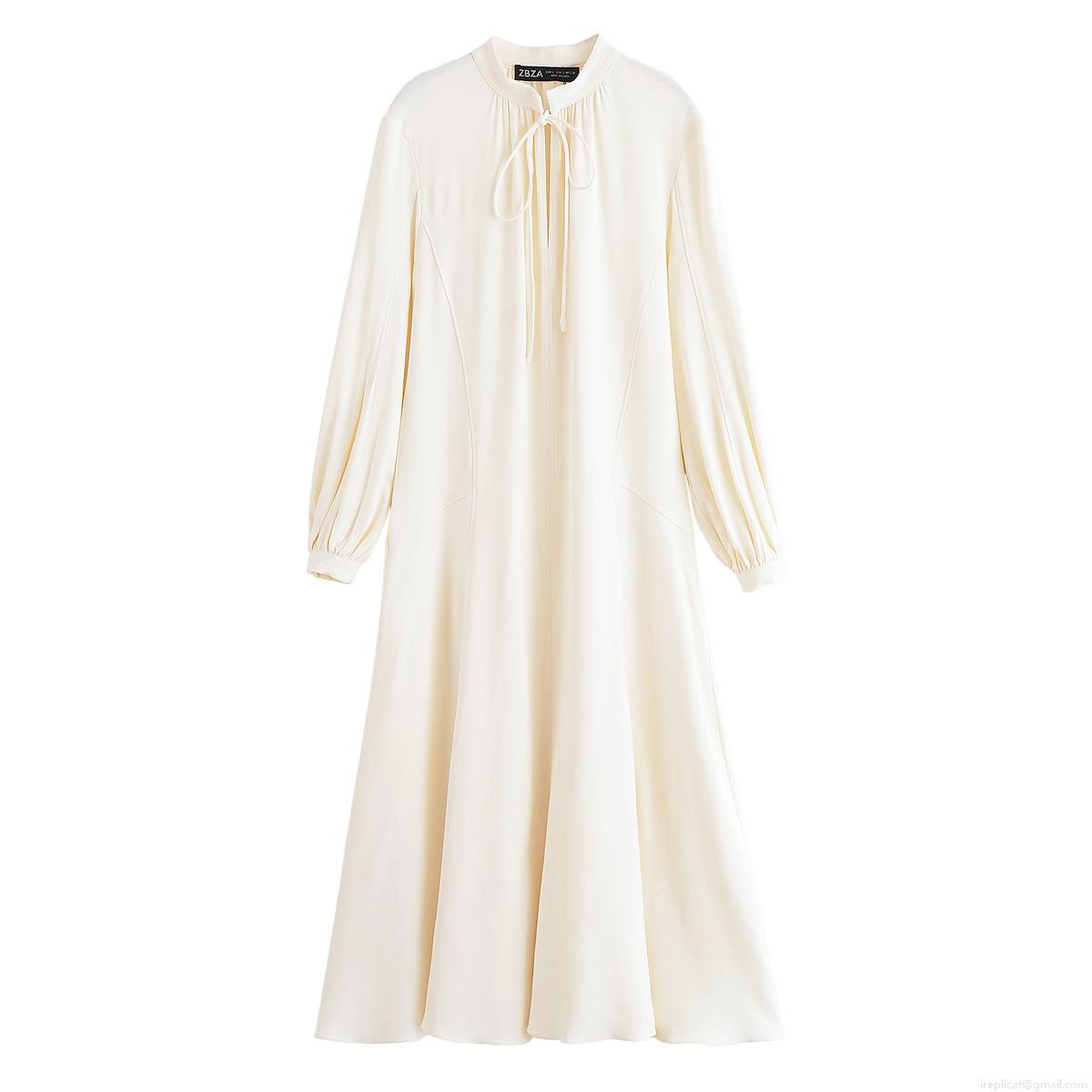 • Elegant Solid Color Polyester Midi Dress Featuring Stand Collar Bow Tie And Lantern Long Sleeves For Women Daily Office Party Minimalist A-Line Dress