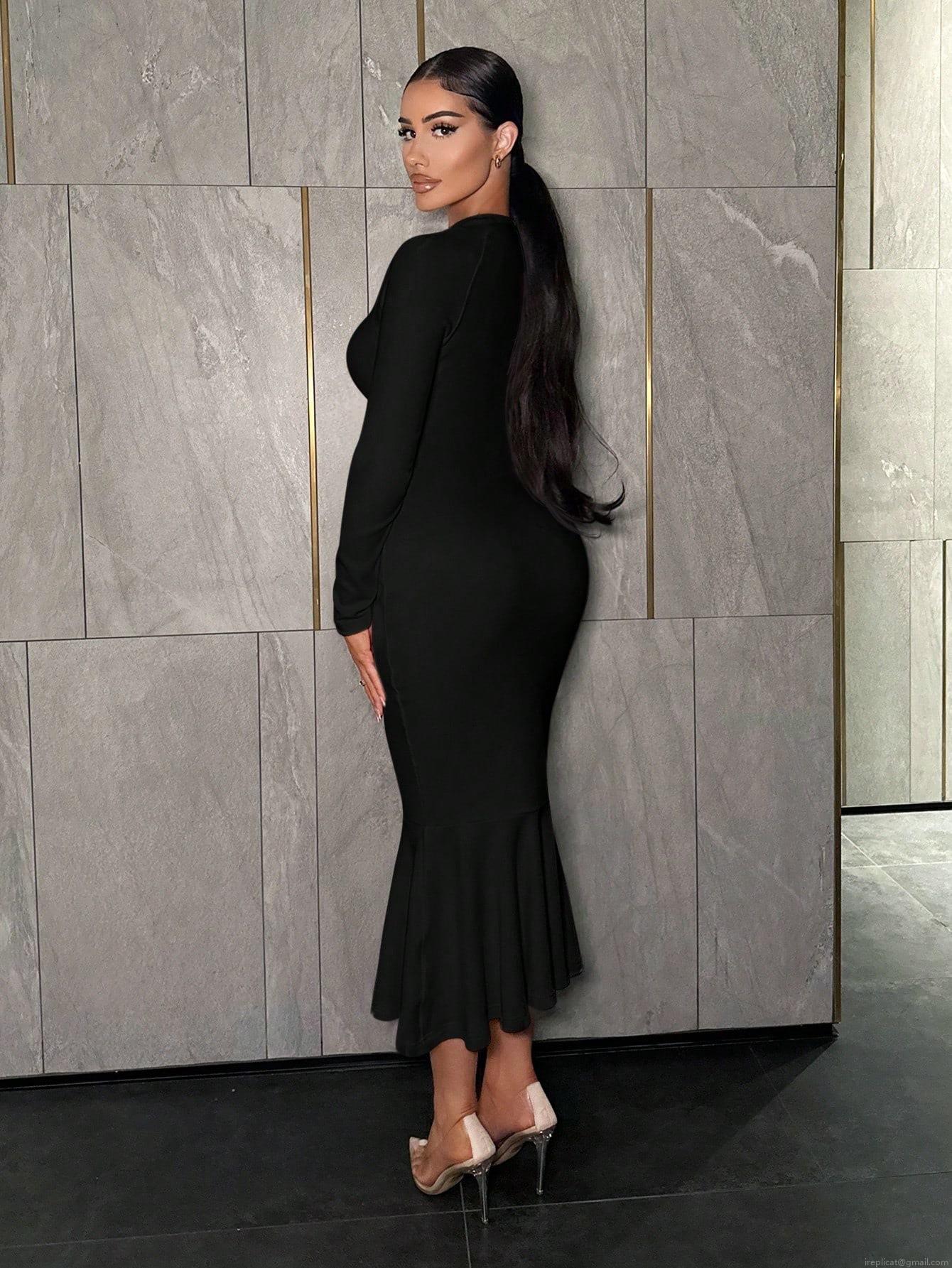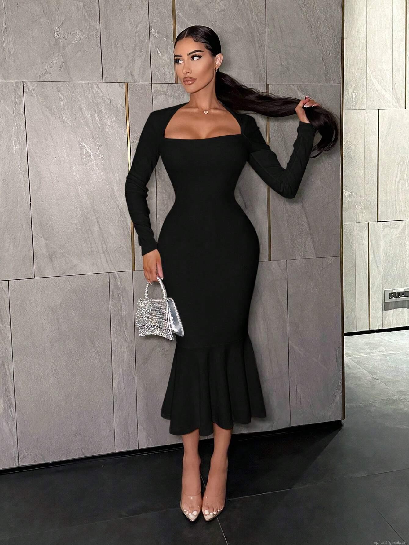 • Elegant Square Neck Long Sleeve Bodycon Midi Dress For Women Sexy Knitted Fishtail Evening Party Clubwear High Waist Solid Color Tight Dress