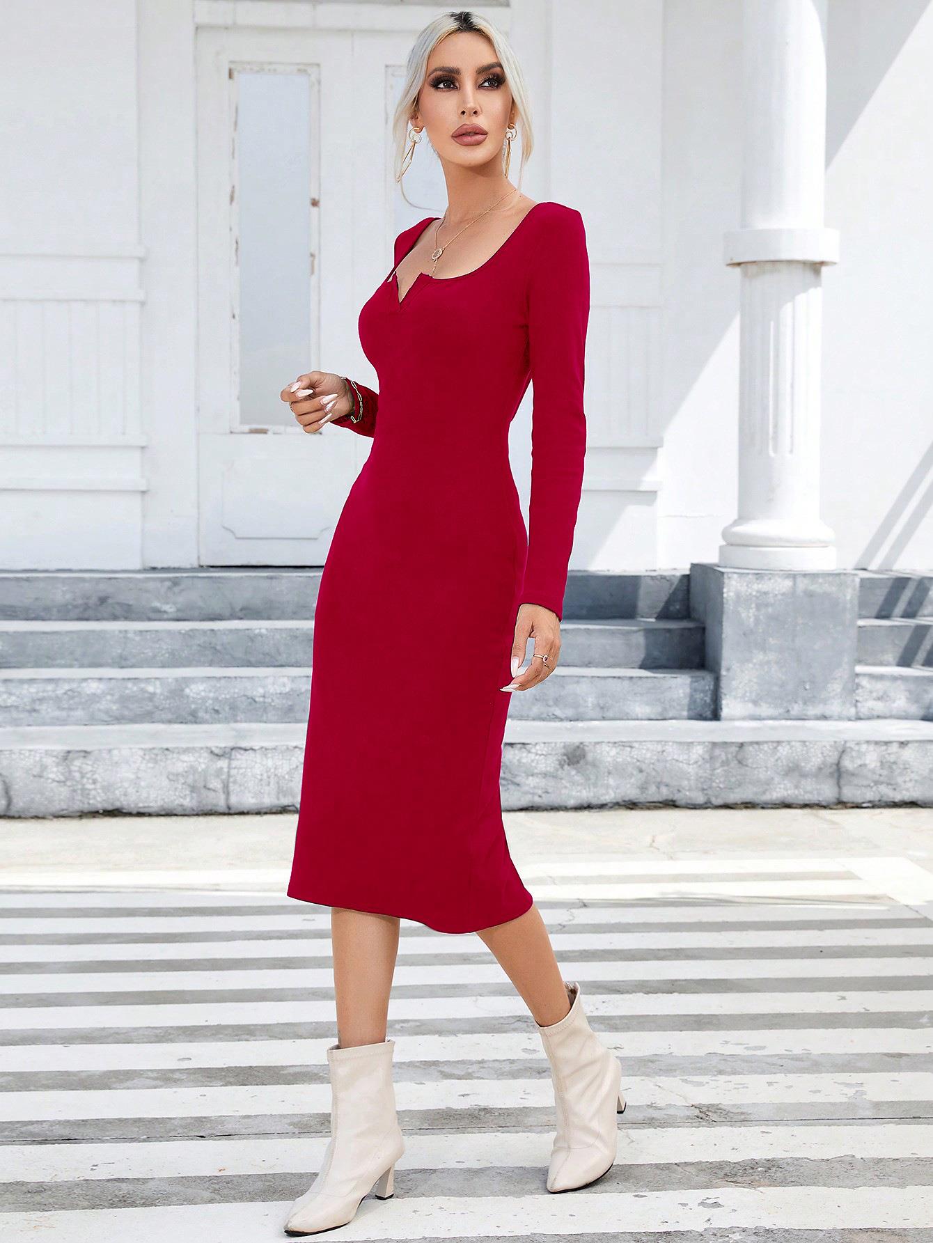 • Elegant Square Neck Long Sleeve Ribbed Knit Midi Dress Women Slim Fit Bodycon Dress With Slit Waist Belt For Party Office Daily Wear