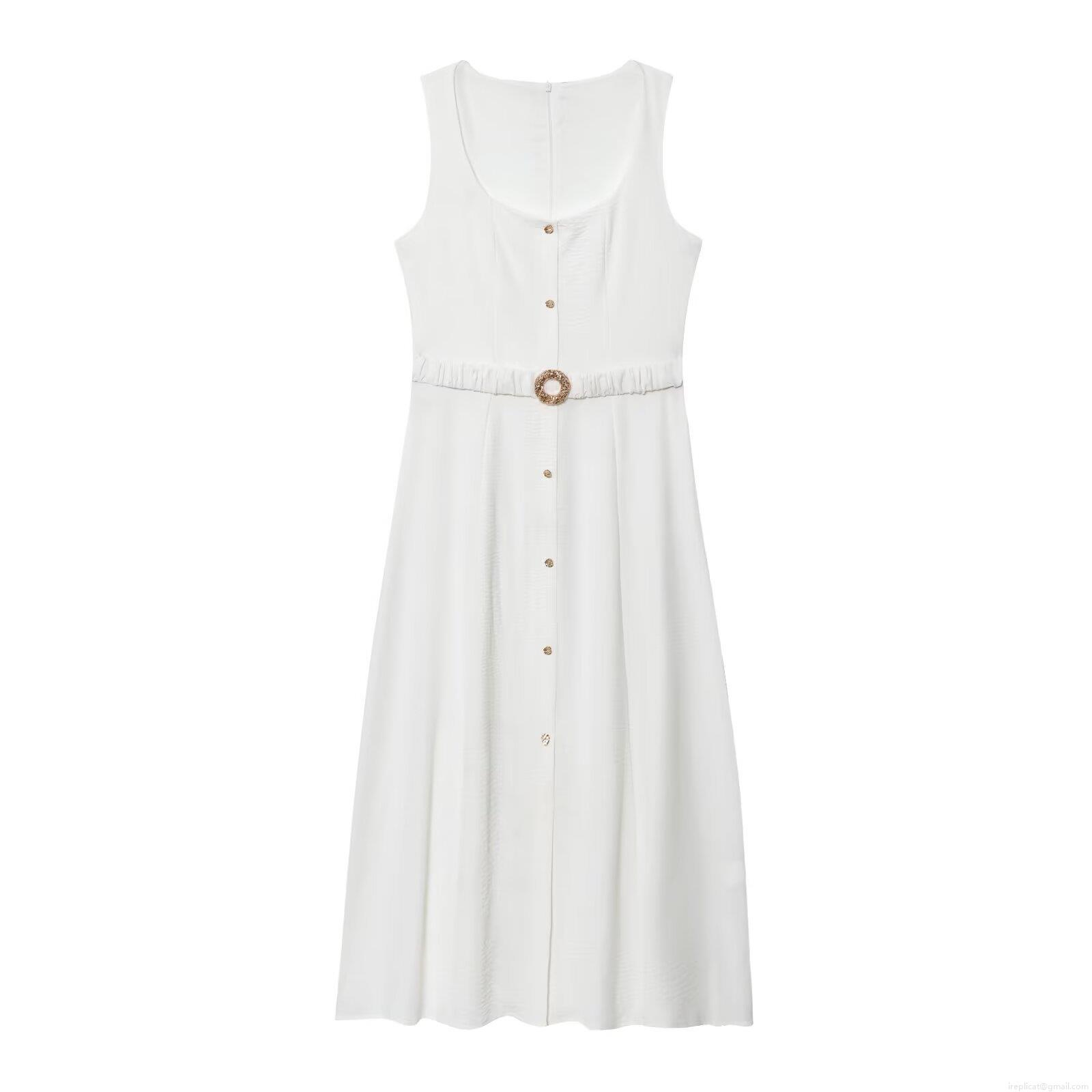 • Elegant Square Neck Sleeveless Midi Dress Polyester Ice Silk Wrinkle Texture Solid Color One-Piece Dress With Belt Gold Buckle Button Detail For Women Streetwear Fashion Dating Party Office Lady Back Zipper Slim Fit